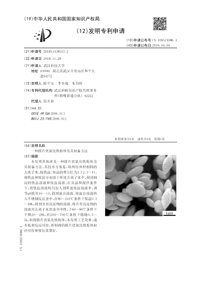 本发明具体涉及一种圆片状氧化铁粉体及其制备方法。其技术方案是:取两份体积相同的去离子水,按铁盐∶铵盐的摩尔比为1∶(2.3~4),将铁盐和铵盐分别溶于所述去离子水中,得到相应的铁盐溶液和铵盐溶液。在常温和搅拌条件下,将铁盐溶液均匀加入到所述铵盐溶液中,调节pH值至10~14,得到混合溶液。将混合溶液转入不锈钢反应釜中,在80~210℃条件下保温0.5~48h,得到含有沉淀物的溶液。将含有沉淀物的溶液用去离子水洗涤至中性,于60~80℃条件下干燥20~28h,在200~700℃条件下煅烧0.5~5h,制得圆片状氧化铁粉体。本发明工艺简单、成本低和反应可控,所制得的圆片状氧化铁粉体粒径可控和催化效果好。