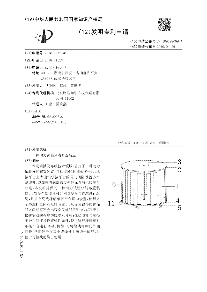 本发明涉及布线技术领域,公开了一种动力试验分线布置装置,包括:绕线杆和承接平台;承接平台上表面沿承接平台的周向间隔设置多个绕线杆,绕线杆的底部通过弹性元件与承接平台相连。本发明提供的一种动力试验分线布置装置,设置多个绕线杆可分别对多根传输线进行缠绕,且多个绕线杆沿承接平台周向设置,使得多个绕线杆之间相互影响较小,从而使得多根传输线之间相互不会出现交叉缠线等影响,有利于多根传输线的有序缠绕以及使用;在绕线杆与承接平台之间连接设置弹性元件,使得绕线杆可相对承接平台进行转动,例如,可将绕线杆朝向外侧打开,从而便于在每个绕线杆上缠绕传输线,且便于传输线的绕出使用。
