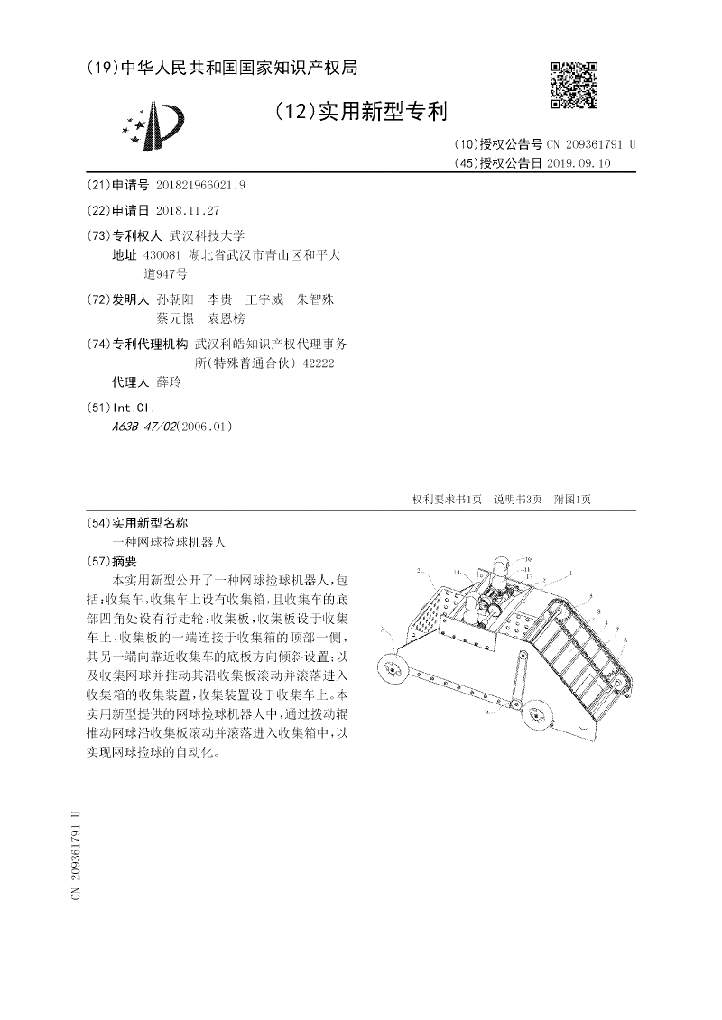 本实用新型公开了一种网球捡球机器人,包括:收集车,收集车上设有收集箱,且收集车的底部四角处设有行走轮;收集板,收集板设于收集车上,收集板的一端连接于收集箱的顶部一侧,其另一端向靠近收集车的底板方向倾斜设置;以及收集网球并推动其沿收集板滚动并滚落进入收集箱的收集装置,收集装置设于收集车上。本实用新型提供的网球捡球机器人中,通过拨动辊推动网球沿收集板滚动并滚落进入收集箱中,以实现网球捡球的自动化。