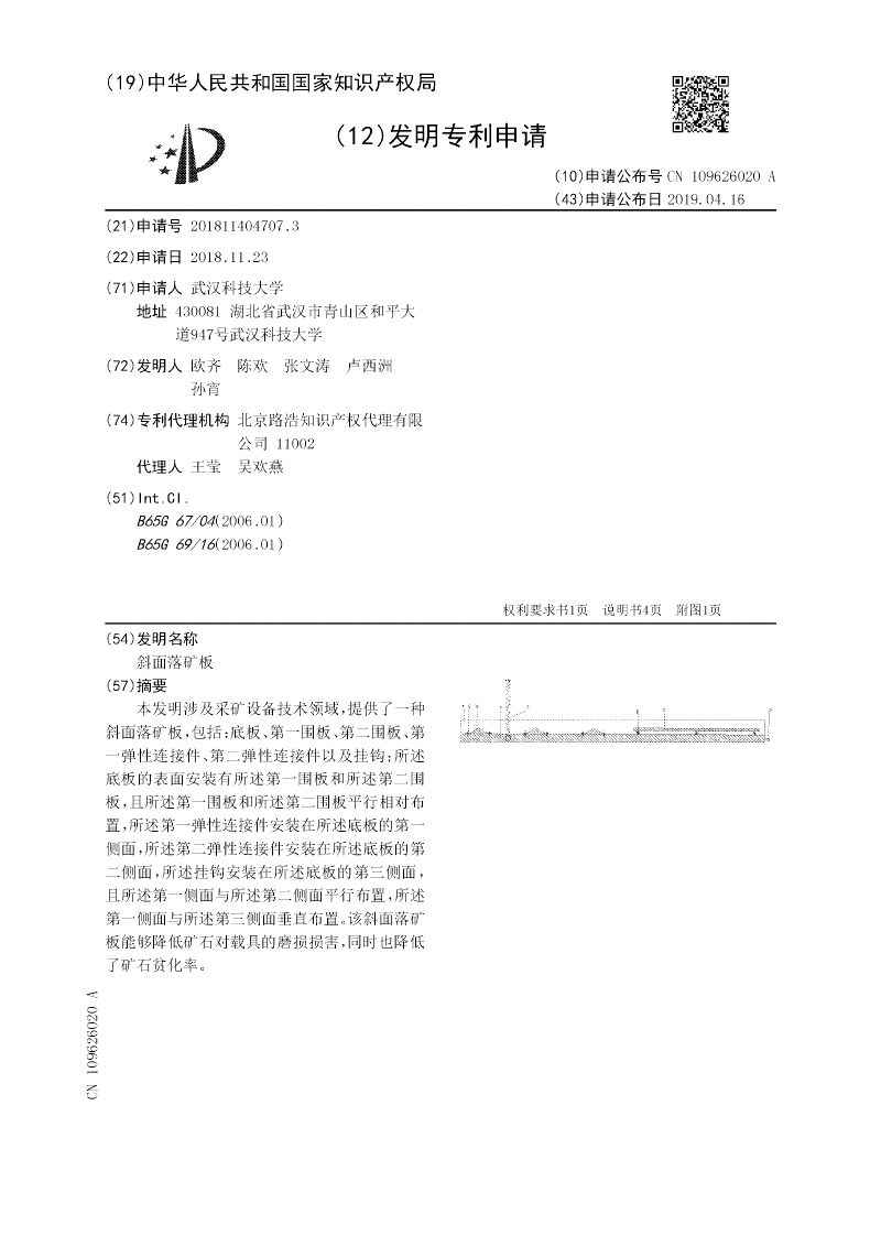本实用新型涉及采矿设备技术领域,提供了一种斜面落矿板,包括:底板、第一围板、第二围板、第一弹性连接件、第二弹性连接件以及挂钩;所述底板的表面安装有所述第一围板和所述第二围板,且所述第一围板和所述第二围板平行相对布置,所述第一弹性连接件安装在所述底板的第一侧面,所述第二弹性连接件安装在所述底板的第二侧面,所述挂钩安装在所述底板的第三侧面,且所述第一侧面与所述第二侧面平行布置,所述第一侧面与所述第三侧面垂直布置。该斜面落矿板能够降低矿石对载具的磨损损害,同时也降低了矿石贫化率。