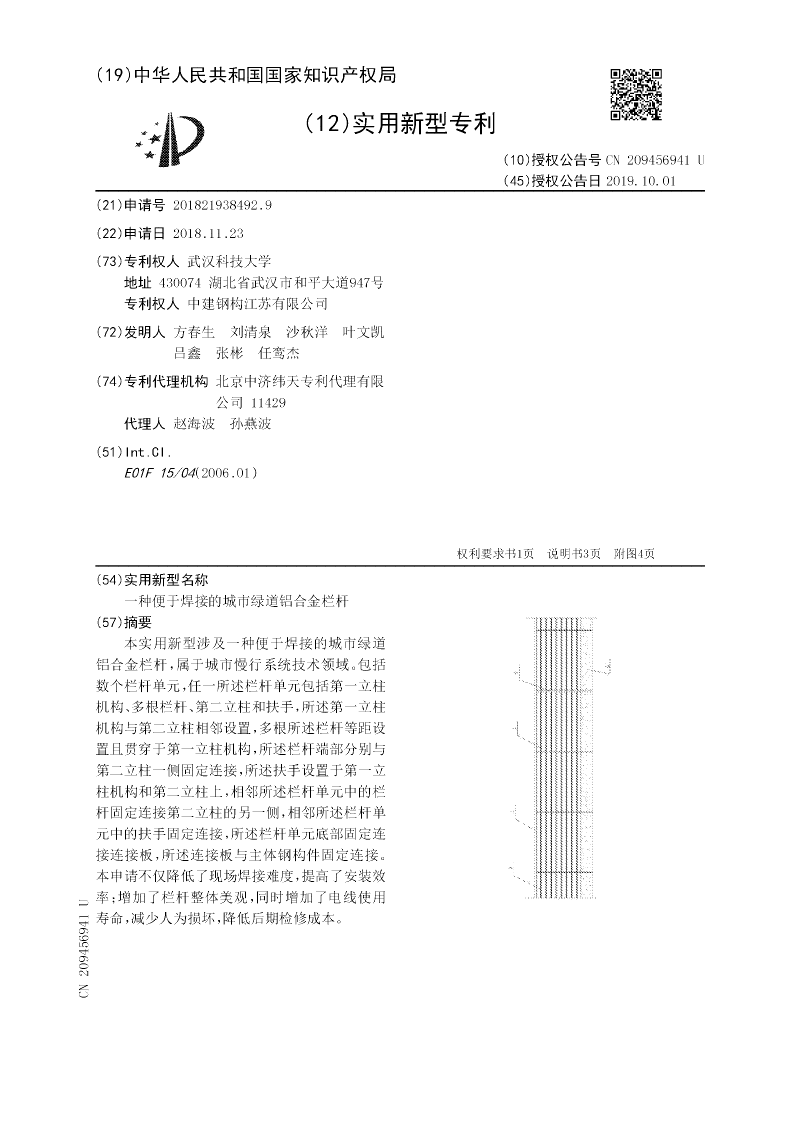 本实用新型涉及一种便于焊接的城市绿道铝合金栏杆,属于城市慢行系统技术领域。包括数个栏杆单元,任一所述栏杆单元包括第一立柱机构、多根栏杆、第二立柱和扶手,所述第一立柱机构与第二立柱相邻设置,多根所述栏杆等距设置且贯穿于第一立柱机构,所述栏杆端部分别与第二立柱一侧固定连接,所述扶手设置于第一立柱机构和第二立柱上,相邻所述栏杆单元中的栏杆固定连接第二立柱的另一侧,相邻所述栏杆单元中的扶手固定连接,所述栏杆单元底部固定连接连接板,所述连接板与主体钢构件固定连接。本申请不仅降低了现场焊接难度,提高了安装效率;增加了栏杆整体美观,同时增加了电线使用寿命,减少人为损坏,降低后期检修成本。