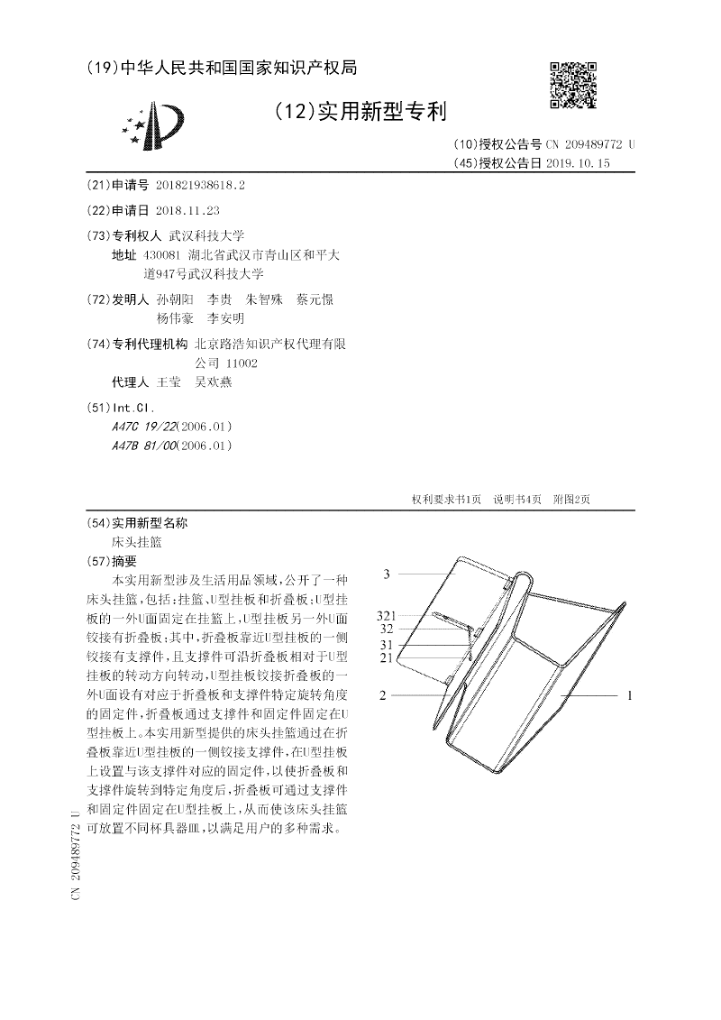 本实用新型涉及生活用品领域,公开了一种床头挂篮,包括:挂篮、U型挂板和折叠板;U型挂板的一外U面固定在挂篮上,U型挂板另一外U面铰接有折叠板;其中,折叠板靠近U型挂板的一侧铰接有支撑件,且支撑件可沿折叠板相对于U型挂板的转动方向转动,U型挂板铰接折叠板的一外U面设有对应于折叠板和支撑件特定旋转角度的固定件,折叠板通过支撑件和固定件固定在U型挂板上。本实用新型提供的床头挂篮通过在折叠板靠近U型挂板的一侧铰接支撑件,在U型挂板上设置与该支撑件对应的固定件,以使折叠板和支撑件旋转到特定角度后,折叠板可通过支撑件和固定件固定在U型挂板上,从而使该床头挂篮可放置不同杯具器皿,以满足用户的多种需求。