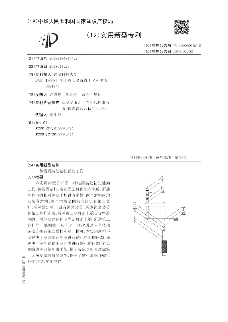 本实用新型公开了一种锚固高处钻孔辅助工具,包括固定杆,所述固定杆内设有空腔,所述空腔内的相对侧壁上均设有滑槽,两个滑槽内均安装有滑块,两个滑块之间共同固定有第二竖杆,所述固定杆上设有锁紧装置,所述锁紧装置和第二竖杆连接,所述第二竖杆的上端贯穿空腔内的一端侧壁并延伸至固定杆的上端,所述第二竖杆的一端侧壁上从上至下依次通过两个转轴转动连接有第二横杆和第一横杆。本实用新型不仅解决了不方便在高空进行钻孔作业的问题,还解决了不能在狭小空间内进行钻孔的问题,避免在临边洞口使用脚手架、梯子等危险因素造成施工人员受伤的情况发生,提高了钻孔效率,同时,制作方便,实用性强。