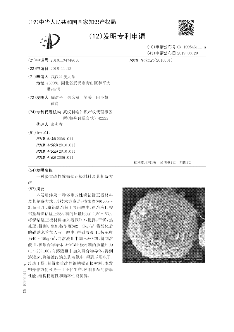 ,向溶液Ⅱ中加入A‑NCM,得到溶液Ⅲ。按聚合物导体∶A‑NCM正极材料的质量比为(1~2)∶100,向溶液Ⅲ中加入聚合物导体,得到溶液Ⅳ。将溶液Ⅳ滴加到液氮中,得到球形珠子,冷冻干燥,制得多重改性镍钴锰正极材料。本发明操作方便和易于工业化生产,所制制品的倍率性能、结构稳定性和循环性能优异。