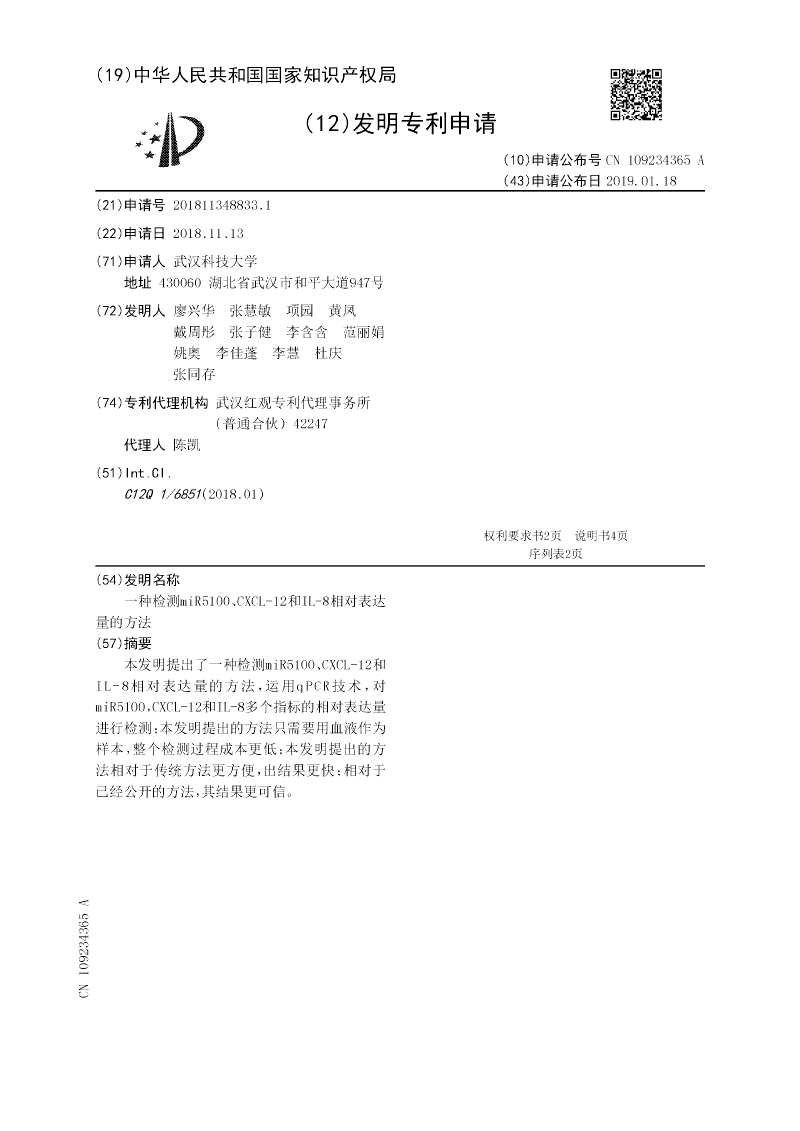 本发明提出了一种检测miR5100、CXCL‑12和IL‑8相对表达量的方法,运用qPCR技术,对miR5100,CXCL‑12和IL‑8多个指标的相对表达量进行检测;本发明提出的方法只需要用血液作为样本,整个检测过程成本更低;本发明提出的方法相对于传统方法更方便,出结果更快;相对于已经公开的方法,其结果更可信。