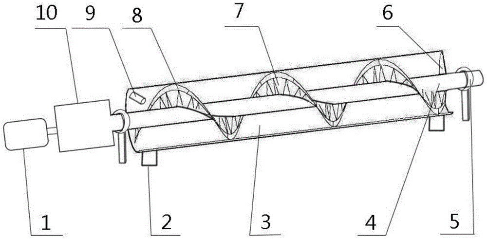 本实用新型公开了一种烧结用新型圆筒混料机,包括发动机、圆筒支撑架、圆筒、传动齿轮与齿轮轴配合装置,所述圆筒支撑架设置在圆筒的底部,所述圆筒内设置有一个两端伸出筒体外的刚性材料制成的中心轴,所述中心轴的一端通过传动齿轮与齿轮轴配合装置与发动机连接,所述中心轴的两端设置有轴承架,绕所述中心轴设置有刚性的螺旋页板,所述螺旋页板的尾端设置有可拆卸的刮刀。本实用新型适用于烧结厂炼铁物料的第一次混合,用以解决烧结生产过程中一次混合中混料不够均匀的问题。