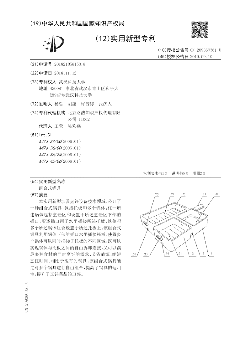 本实用新型涉及烹饪设备技术领域,公开了一种组合式锅具,包括托板和多个锅体;任一所述锅体包括烹饪区和设置于所述烹饪区下部的插口,所述插口用于水平插接所述托板,以使得多个所述锅体组合设置于所述托板上。该组合式锅具利用锅体下部的插口水平插接托板,使得多个锅体可以同时插接于托板的不同区域,既可以实现锅体与托板之间的自由拆卸连接,又可以满足多种食材的同时烹饪的需求,节省能源,缩短烹饪时间。相比于现有的锅具,该组合式锅具通过对多个锅具进行自由组合,提高了锅具的适用性,提升了烹饪菜品的口感。
