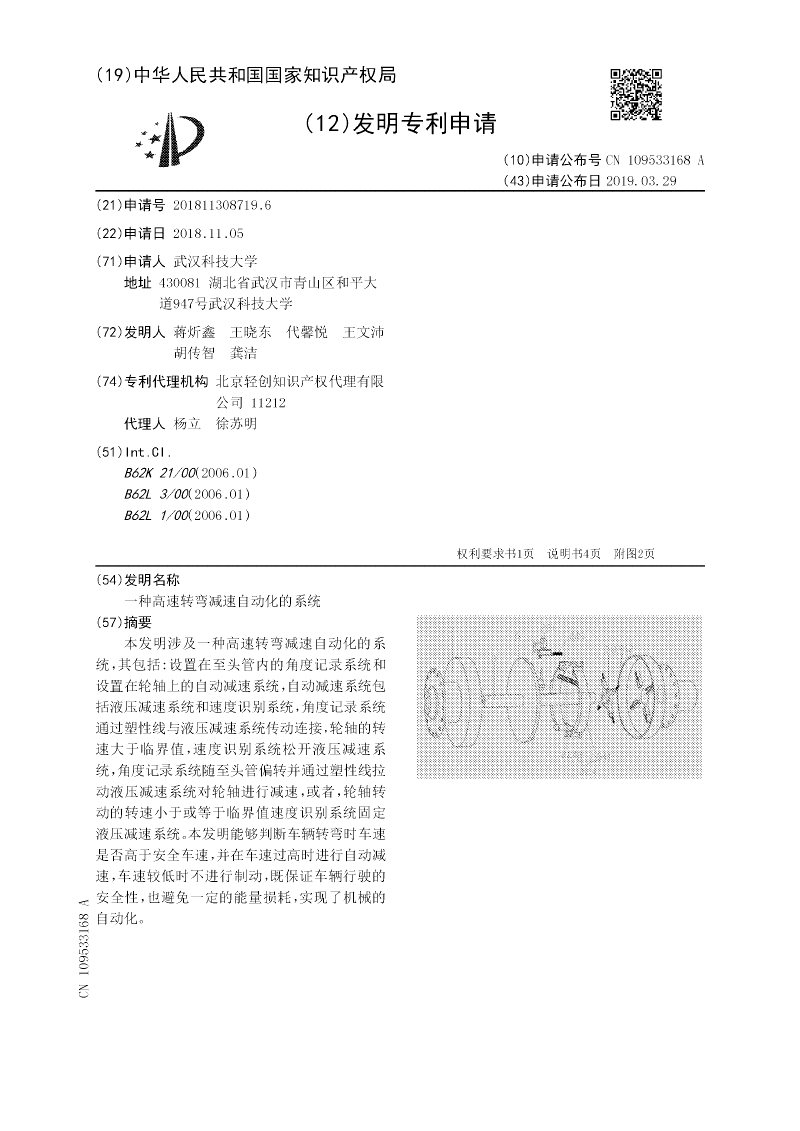 本发明涉及一种高速转弯减速自动化的系统,其包括:设置在至头管内的角度记录系统和设置在轮轴上的自动减速系统,自动减速系统包括液压减速系统和速度识别系统,角度记录系统通过塑性线与液压减速系统传动连接,轮轴的转速大于临界值,速度识别系统松开液压减速系统,角度记录系统随至头管偏转并通过塑性线拉动液压减速系统对轮轴进行减速,或者,轮轴转动的转速小于或等于临界值速度识别系统固定液压减速系统。本发明能够判断车辆转弯时车速是否高于安全车速,并在车速过高时进行自动减速,车速较低时不进行制动,既保证车辆行驶的安全性,也避免一定的能量损耗,实现了机械的自动化。