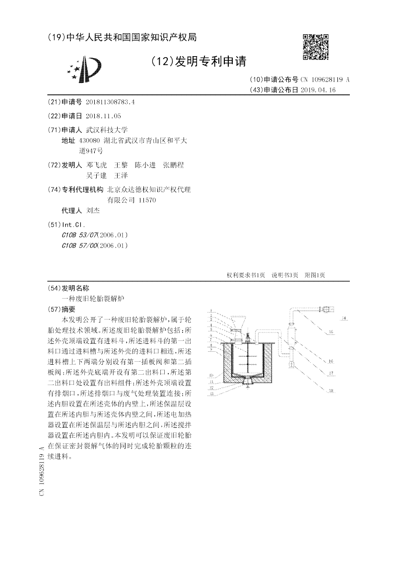 本发明公开了一种废旧轮胎裂解炉,属于轮胎处理技术领域。所述废旧轮胎裂解炉包括:所述外壳顶端设置有进料斗,所述进料斗的第一出料口通过进料槽与所述外壳的进料口相连,所述进料槽上下两端分别设有第一插板阀和第二插板阀;所述外壳底端开设有第二出料口,所述第二出料口处设置有出料组件;所述外壳顶端设置有排烟口,所述排烟口与废气处理装置连接;所述内胆设置在所述壳体的内壁上,所述保温层设置在所述内胆与所述壳体内壁之间,所述电加热器设置在所述保温层与所述内胆之间,所述搅拌器设置在所述内胆内。本发明可以保证废旧轮胎在保证密封裂解气体的同时完成轮胎颗粒的连续进料。