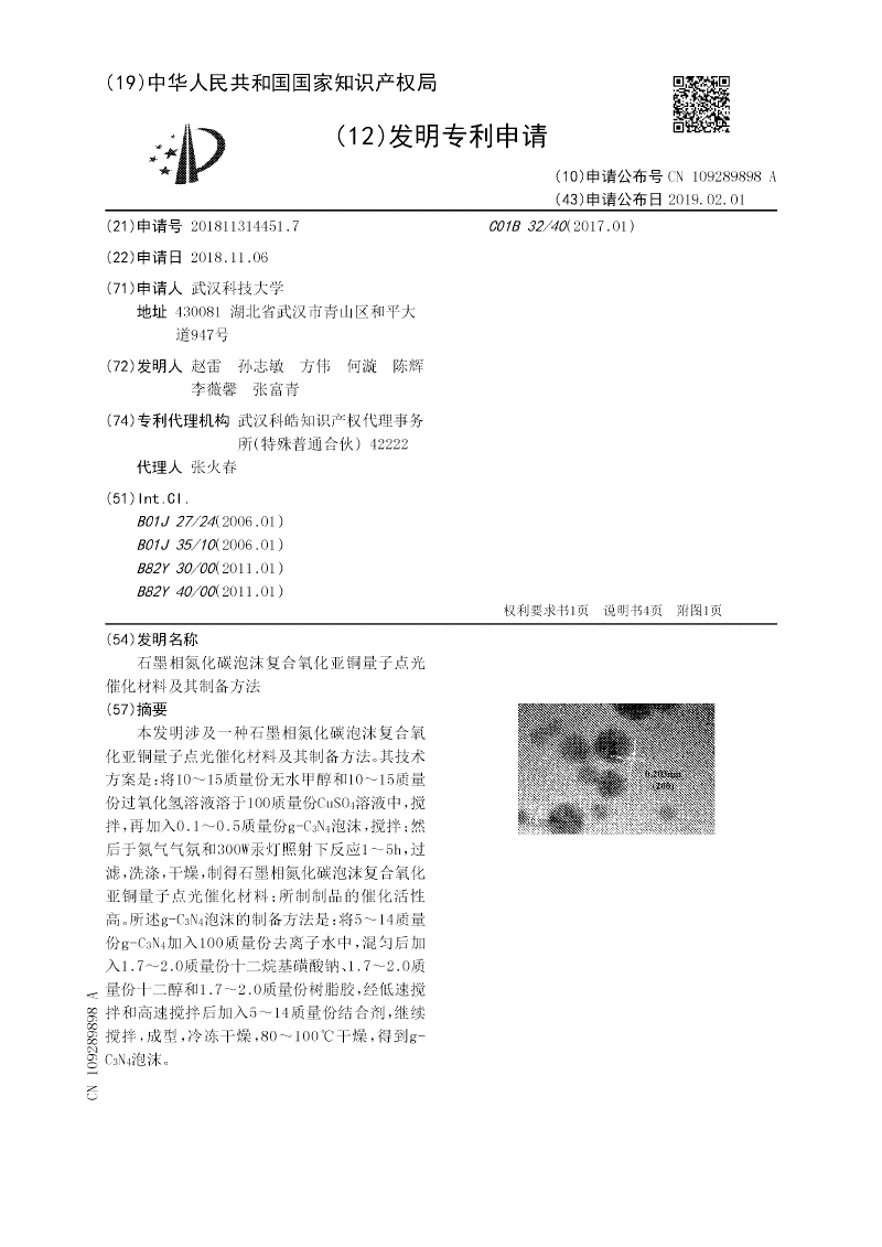 泡沫,搅拌;然后于氮气气氛和300W汞灯照射下反应1~5h,过滤,洗涤,干燥,制得石墨相氮化碳泡沫复合氧化亚铜量子点光催化材料;所制制品的催化活性高。所述g‑C