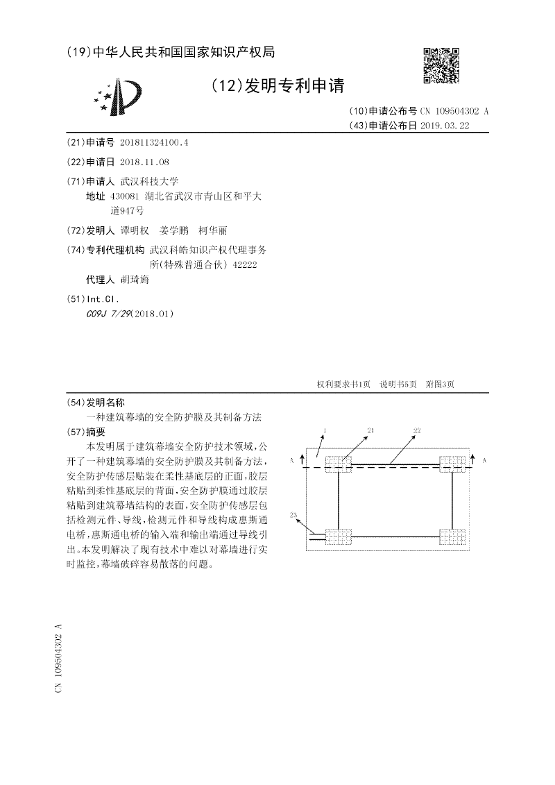 本发明属于建筑幕墙安全防护技术领域,公开了一种建筑幕墙的安全防护膜及其制备方法,安全防护传感层贴装在柔性基底层的正面,胶层粘贴到柔性基底层的背面,安全防护膜通过胶层粘贴到建筑幕墙结构的表面,安全防护传感层包括检测元件、导线,检测元件和导线构成惠斯通电桥,惠斯通电桥的输入端和输出端通过导线引出。本发明解决了现有技术中难以对幕墙进行实时监控,幕墙破碎容易散落的问题。