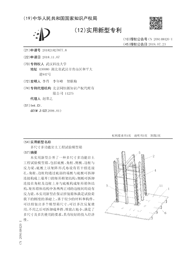 本实用新型公开了一种多尺寸多功能岩土工程试验模型箱,包括底板、角柱、侧板、边柱与反力梁;底板上以矩阵形式布设有若干组连接孔,角柱、边柱均通过底部的端板与底板可拆卸连接构成上端开口的矩形框架结构;侧板可拆卸连接在角柱及边柱上并与底板构成矩形箱体结构,矩形箱体结构中各两两正对的边柱间均设有反力梁。本实用新型在保证拼装箱体满足试验荷载下的刚度的基础上,基于较少的材料和构件,可以组装出多个模型箱尺寸,可以多次反复使用,不用之后可拆卸成单件,堆放占地小,满足了多尺寸及多次使用的要求,具有较好的投入经济性。