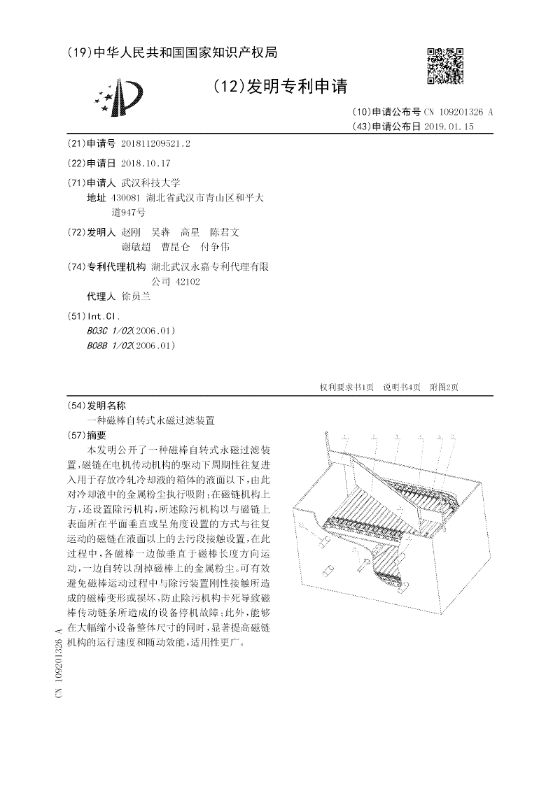 本发明公开了一种磁棒自转式永磁过滤装置,磁链在电机传动机构的驱动下周期性往复进入用于存放冷轧冷却液的箱体的液面以下,由此对冷却液中的金属粉尘执行吸附;在磁链机构上方,还设置除污机构,所述除污机构以与磁链上表面所在平面垂直或呈角度设置的方式与往复运动的磁链在液面以上的去污段接触设置,在此过程中,各磁棒一边做垂直于磁棒长度方向运动,一边自转以刮掉磁棒上的金属粉尘。可有效避免磁棒运动过程中与除污装置刚性接触所造成的磁棒变形或损坏,防止除污机构卡死导致磁棒传动链条所造成的设备停机故障;此外,能够在大幅缩小设备整体尺寸的同时,显著提高磁链机构的运行速度和随动效能,适用性更广。