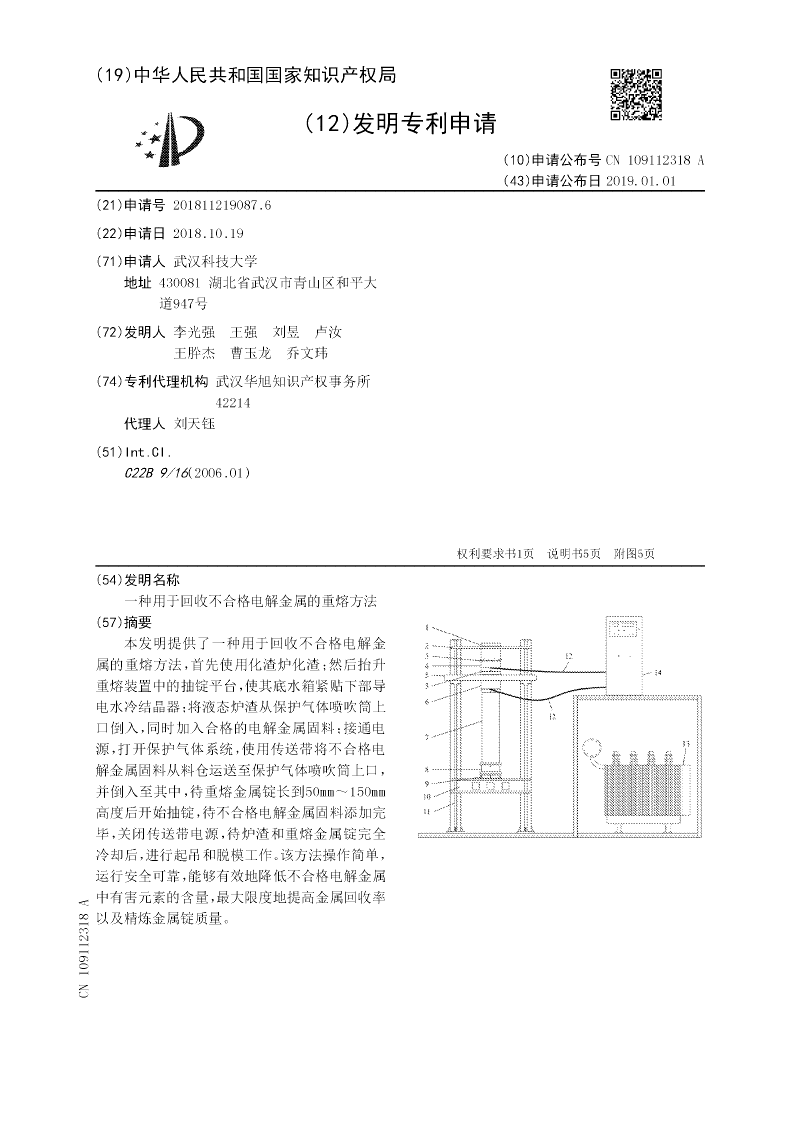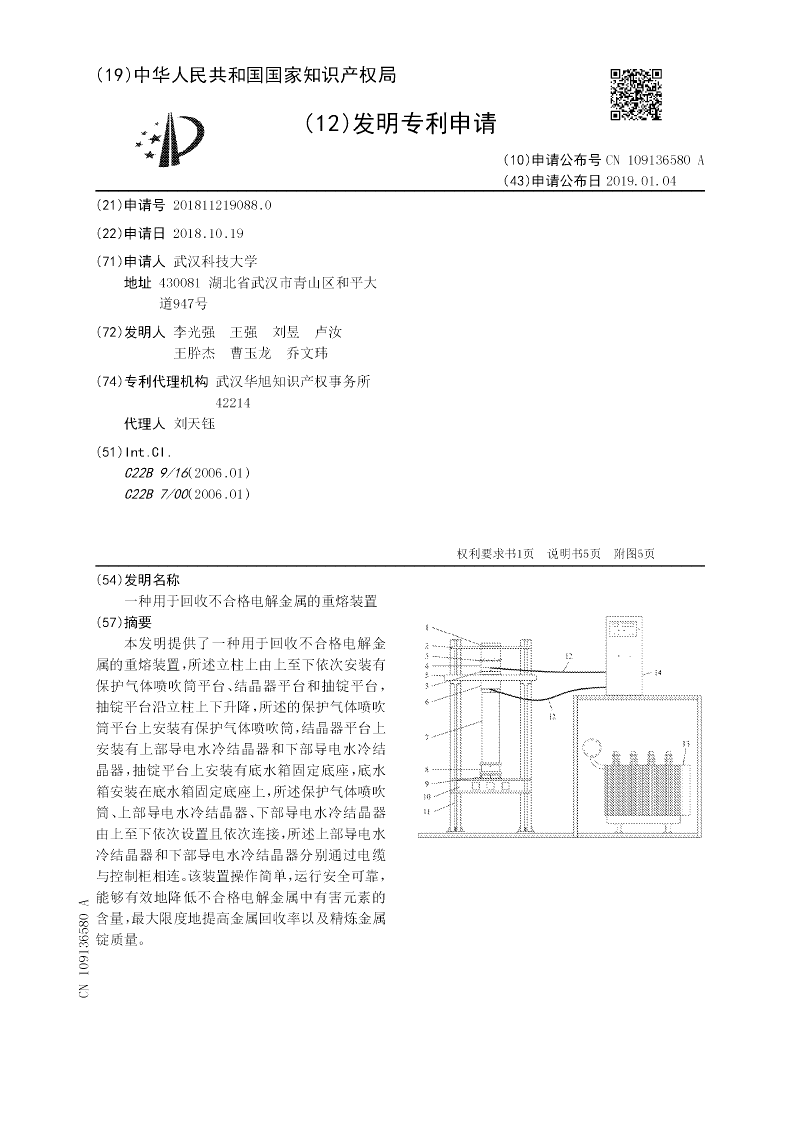 本发明提供了一种用于回收不合格电解金属的重熔装置,所述立柱上由上至下依次安装有保护气体喷吹筒平台、结晶器平台和抽锭平台,抽锭平台沿立柱上下升降,所述的保护气体喷吹筒平台上安装有保护气体喷吹筒,结晶器平台上安装有上部导电水冷结晶器和下部导电水冷结晶器,抽锭平台上安装有底水箱固定底座,底水箱安装在底水箱固定底座上,所述保护气体喷吹筒、上部导电水冷结晶器、下部导电水冷结晶器由上至下依次设置且依次连接,所述上部导电水冷结晶器和下部导电水冷结晶器分别通过电缆与控制柜相连。该装置操作简单,运行安全可靠,能够有效地降低不合格电解金属中有害元素的含量,最大限度地提高金属回收率以及精炼金属锭质量。