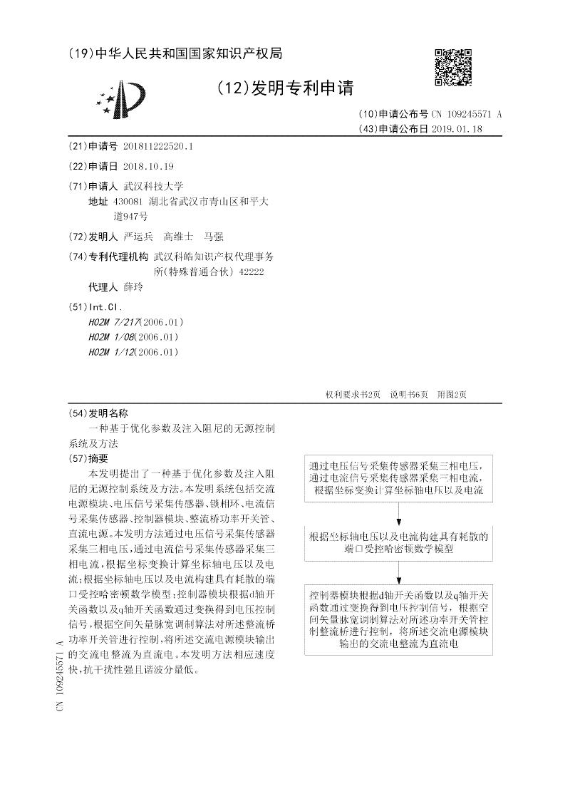 本发明提出了一种基于优化参数及注入阻尼的无源控制系统及方法。本发明系统包括交流电源模块、电压信号采集传感器、锁相环、电流信号采集传感器、控制器模块、整流桥功率开关管、直流电源。本发明方法通过电压信号采集传感器采集三相电压,通过电流信号采集传感器采集三相电流,根据坐标变换计算坐标轴电压以及电流;根据坐标轴电压以及电流构建具有耗散的端口受控哈密顿数学模型;控制器模块根据d轴开关函数以及q轴开关函数通过变换得到电压控制信号,根据空间矢量脉宽调制算法对所述整流桥功率开关管进行控制,将所述交流电源模块输出的交流电整流为直流电。本发明方法相应速度快,抗干扰性强且谐波分量低。