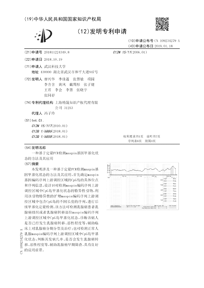 本发明涉及一种基于定量PCR检测maspin基因甲基化状态的方法及其应用,首先确定maspin基因编码序列上游调控区域的CpG岛的具体位点和序列信息,设计10对检测maspin编码序列上游调控区域中CpG岛甲基化状态的特异性引物。利用该引物特异性的扩增maspin编码序列上游调控区域中包含CpG岛的不同长度的序列,进行后续甲基化定量检测。该方法可检测乳腺癌患者乳腺癌组织或者乳腺癌转移部位maspin编码序列上游调控区域中CpG岛甲基化状态,诊断该病人是否已经发生乳腺癌转移、恶性程度等,辅助临床上对乳腺癌分期分型及治疗;也可检测正常人乳腺maspin编码序列上游调控区域中CpG岛甲基化状态,判断其发病几率、是否会发生乳腺癌转移、恶性程度等,辅助乳腺癌早期筛查,具有良好的应用前景。
