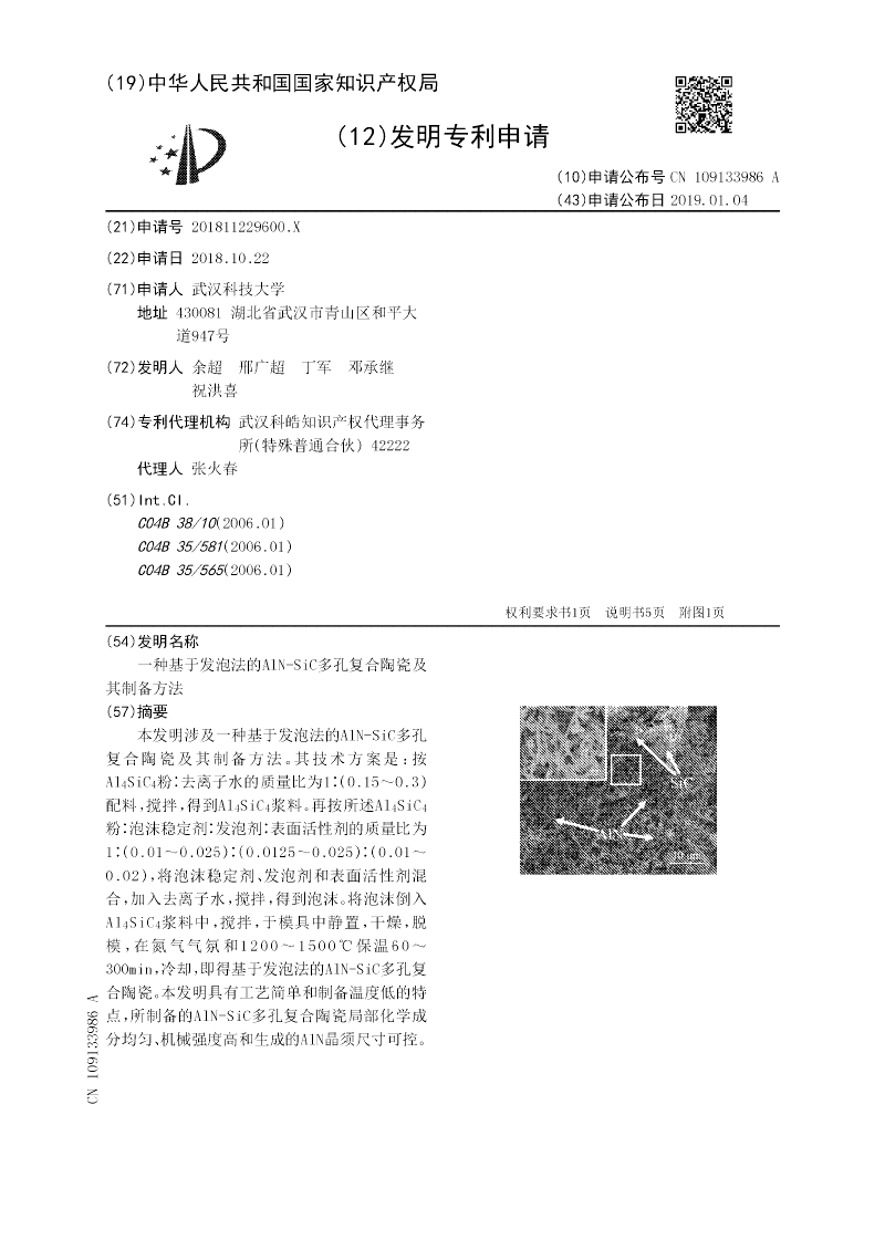 本发明涉及一种基于发泡法的AlN‑SiC多孔复合陶瓷及其制备方法。其技术方案是:按Al