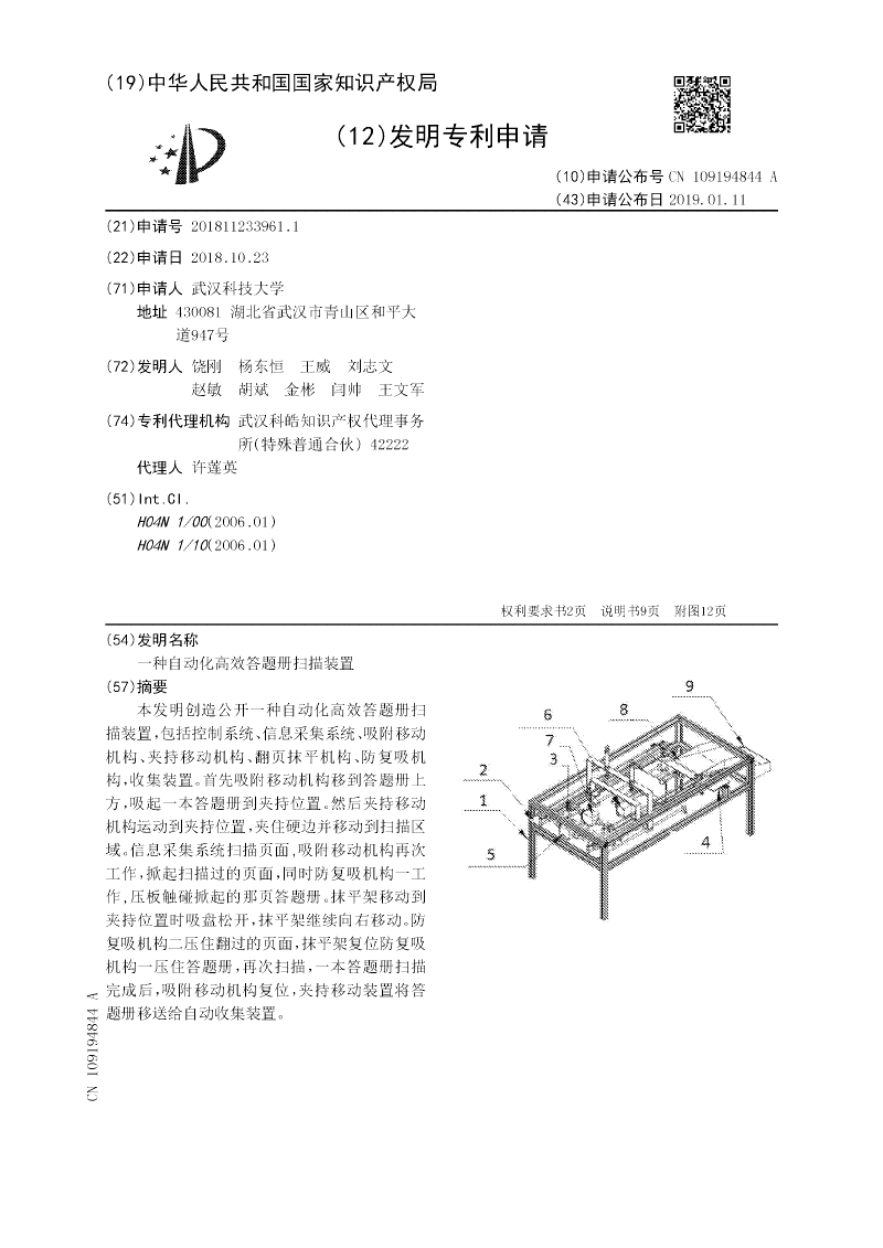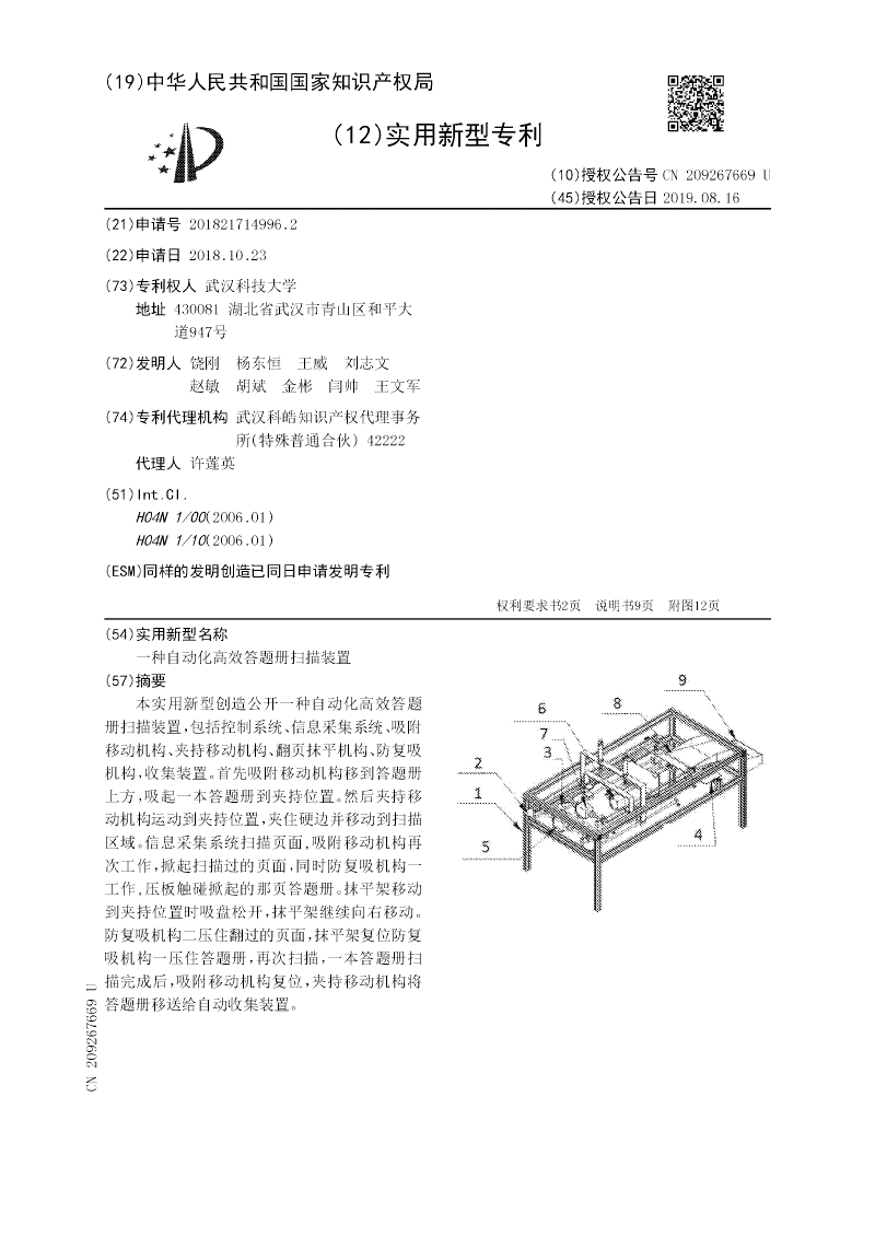 本实用新型创造公开一种自动化高效答题册扫描装置,包括控制系统、信息采集系统、吸附移动机构、夹持移动机构、翻页抹平机构、防复吸机构,收集装置。首先吸附移动机构移到答题册上方,吸起一本答题册到夹持位置。然后夹持移动机构运动到夹持位置,夹住硬边并移动到扫描区域。信息采集系统扫描页面,吸附移动机构再次工作,掀起扫描过的页面,同时防复吸机构一工作,压板触碰掀起的那页答题册。抹平架移动到夹持位置时吸盘松开,抹平架继续向右移动。防复吸机构二压住翻过的页面,抹平架复位防复吸机构一压住答题册,再次扫描,一本答题册扫描完成后,吸附移动机构复位,夹持移动机构将答题册移送给自动收集装置。