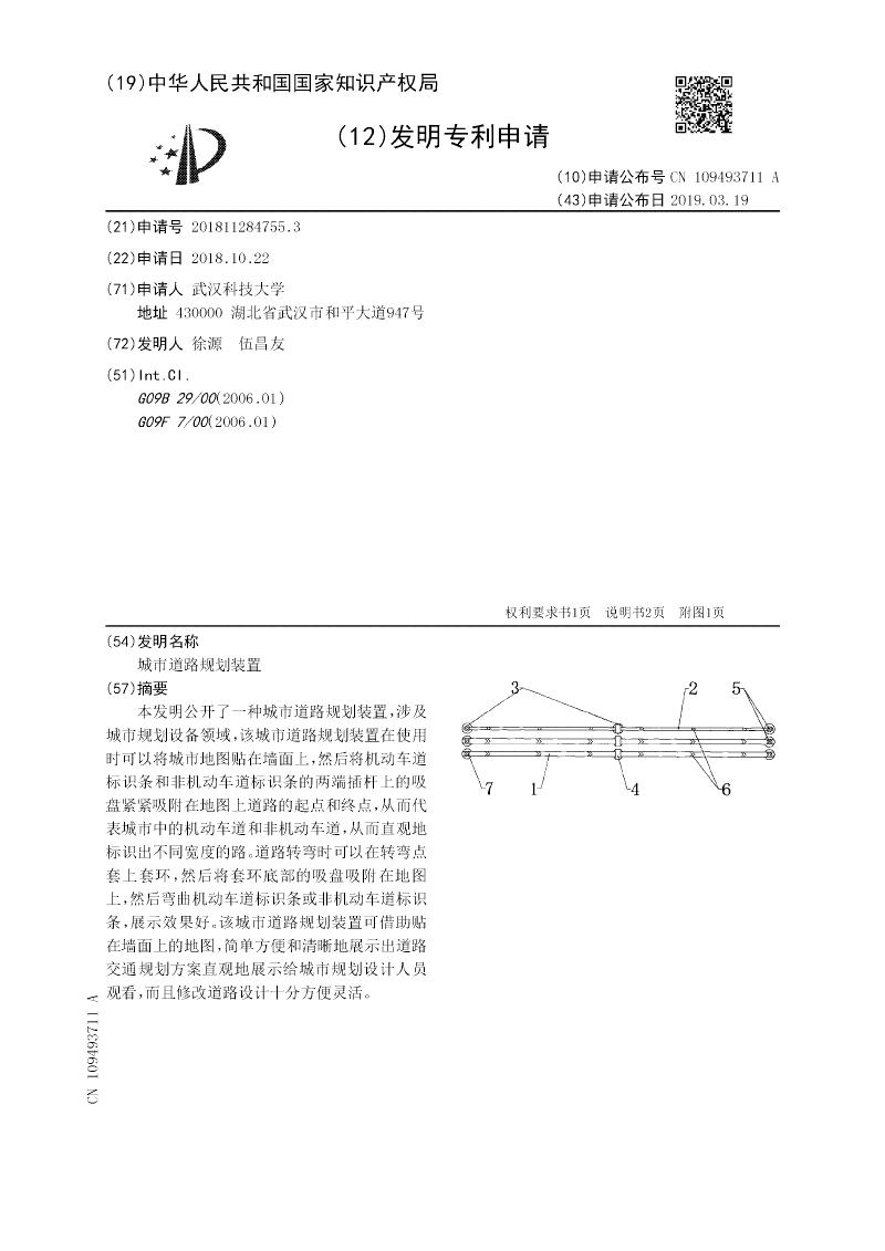 本发明公开了一种城市道路规划装置,涉及城市规划设备领域,该城市道路规划装置在使用时可以将城市地图贴在墙面上,然后将机动车道标识条和非机动车道标识条的两端插杆上的吸盘紧紧吸附在地图上道路的起点和终点,从而代表城市中的机动车道和非机动车道,从而直观地标识出不同宽度的路。道路转弯时可以在转弯点套上套环,然后将套环底部的吸盘吸附在地图上,然后弯曲机动车道标识条或非机动车道标识条,展示效果好。该城市道路规划装置可借助贴在墙面上的地图,简单方便和清晰地展示出道路交通规划方案直观地展示给城市规划设计人员观看,而且修改道路设计十分方便灵活。