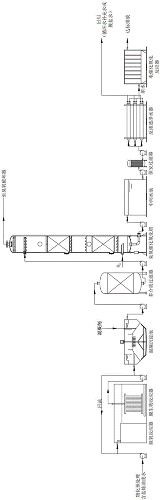本发明公开了一种含盐炼油废水深度处理回用的方法,预处理后的含盐炼油废水先流入缺氧反应器停留8~10h,然后进入膜生物反应器停留15~20h,出水的一部分回流至缺氧反应器、另一部分流入混凝沉淀池;向混凝沉淀池中投加混凝剂进行混凝沉淀;混凝沉淀后出水经多介质过滤器过滤后进入臭氧催化氧化塔,在其内wut‑5型催化剂的催化作用下与臭氧反应12~17min,反应后流入中间水池;中间水池出水进入反渗透膜组件中,反渗透的浓水经电催化氧化后达标排放,反渗透的产水作为循环水的补充水或脱盐水回用。本发明具有工艺简单、设备紧凑、膜污染程度低、工艺运行稳定、回用水水质好等优点。