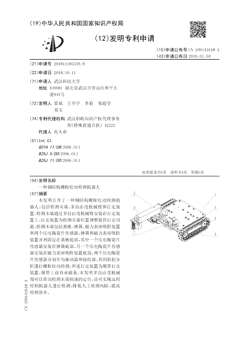 本发明公开了一种钢结构螺栓松动检测机器人,包括检测末端、多自由度机械臂和行走装置,检测末端通过多自由度机械臂安装在行走装置上,行走装置为检测末端位置调整提供行走功能,检测末端包括基板、弹簧、磁力表座吸附装置和两个压电陶瓷片传感器,弹簧和磁力表座吸附装置并列固定在基板底部,其中一个压电陶瓷片传感器安装在弹簧底部,另一个压电陶瓷片传感器安装在磁力表座吸附装置底部,两个压电陶瓷片传感器分别作为驱动器和接收器,利用阻抗分析进行螺栓松动检测,所述行走装置为履带行走装置,履带上设有永磁条。本发明多自由度机械臂可以带动检测末端快速的定位,还可实现远程控制机器人进行检测,降低人工检测风险,提高检测效率。