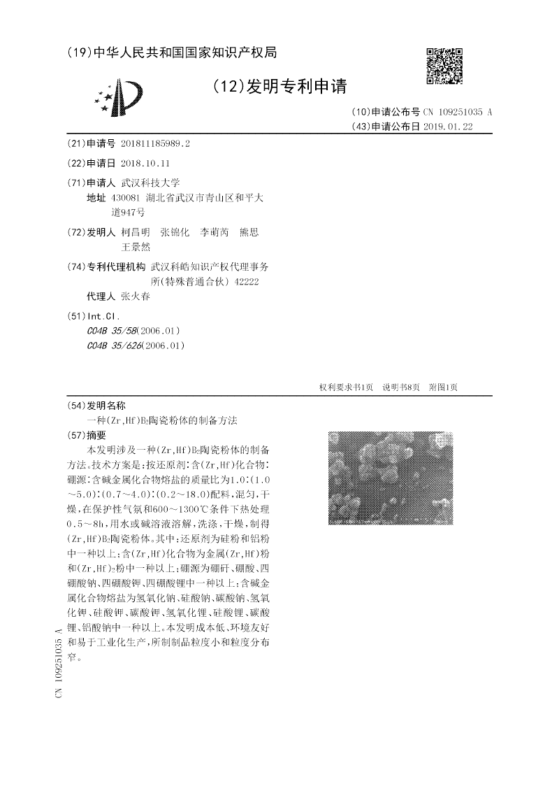 陶瓷粉体的制备方法。技术方案是:按还原剂∶含(Zr,Hf)化合物∶硼源∶含碱金属化合物熔盐的质量比为1.0∶(1.0~5.0)∶(0.7~4.0)∶(0.2~18.0)配料,混匀,干燥,在保护性气氛和600~1300℃条件下热处理0.5~8h,用水或碱溶液溶解,洗涤,干燥,制得(Zr,Hf)B