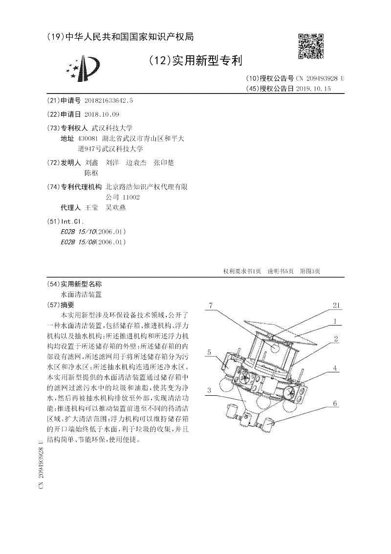 本实用新型涉及环保设备技术领域,公开了一种水面清洁装置,包括储存箱、推进机构、浮力机构以及抽水机构;所述推进机构和所述浮力机构均设置于所述储存箱的外壁;所述储存箱的内部设有滤网,所述滤网用于将所述储存箱分为污水区和净水区;所述抽水机构连通所述净水区。本实用新型提供的水面清洁装置通过储存箱中的滤网过滤污水中的垃圾和油脂,使其变为净水,然后再被抽水机构排放至外部,实现清洁功能;推进机构可以推动装置前进至不同的待清洁区域,扩大清洁范围;浮力机构可以维持储存箱的开口端始终低于水面,利于垃圾的收集,并且结构简单、节能环保,使用便捷。