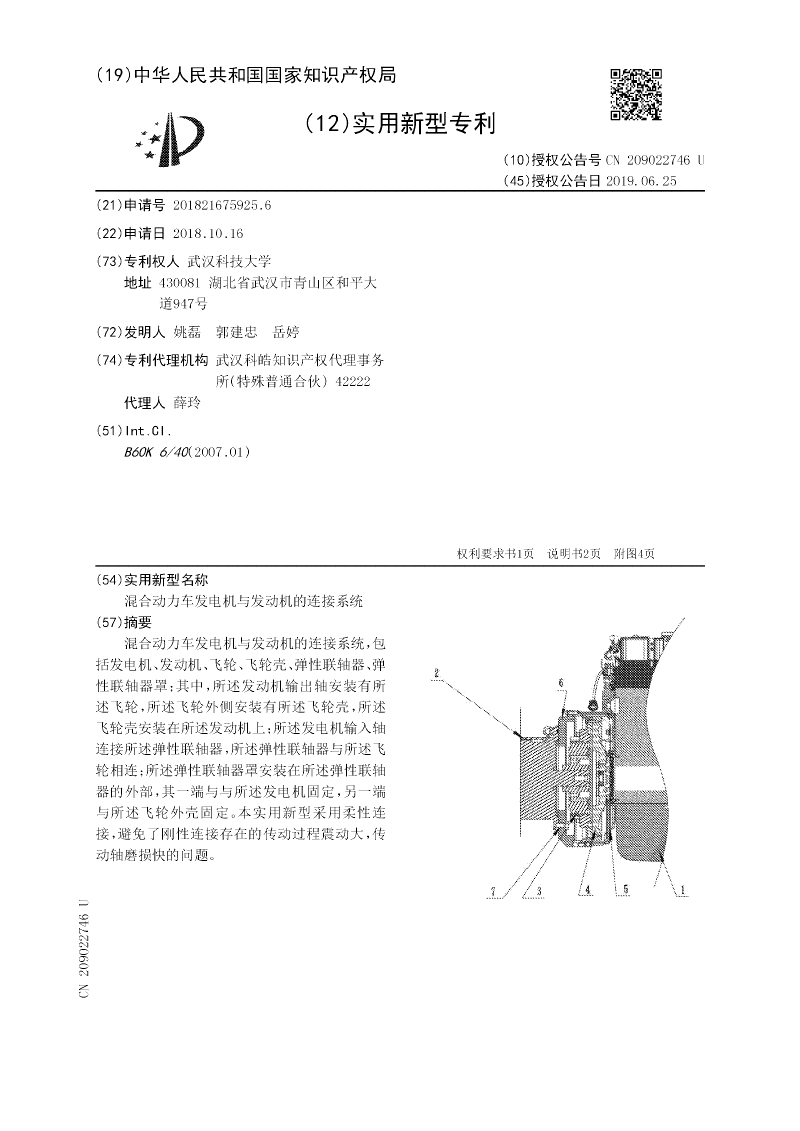 混合动力车发电机与发动机的连接系统,包括发电机、发动机、飞轮、飞轮壳、弹性联轴器、弹性联轴器罩;其中,所述发动机输出轴安装有所述飞轮,所述飞轮外侧安装有所述飞轮壳,所述飞轮壳安装在所述发动机上;所述发电机输入轴连接所述弹性联轴器,所述弹性联轴器与所述飞轮相连;所述弹性联轴器罩安装在所述弹性联轴器的外部,其一端与与所述发电机固定,另一端与所述飞轮外壳固定。本实用新型采用柔性连接,避免了刚性连接存在的传动过程震动大,传动轴磨损快的问题。