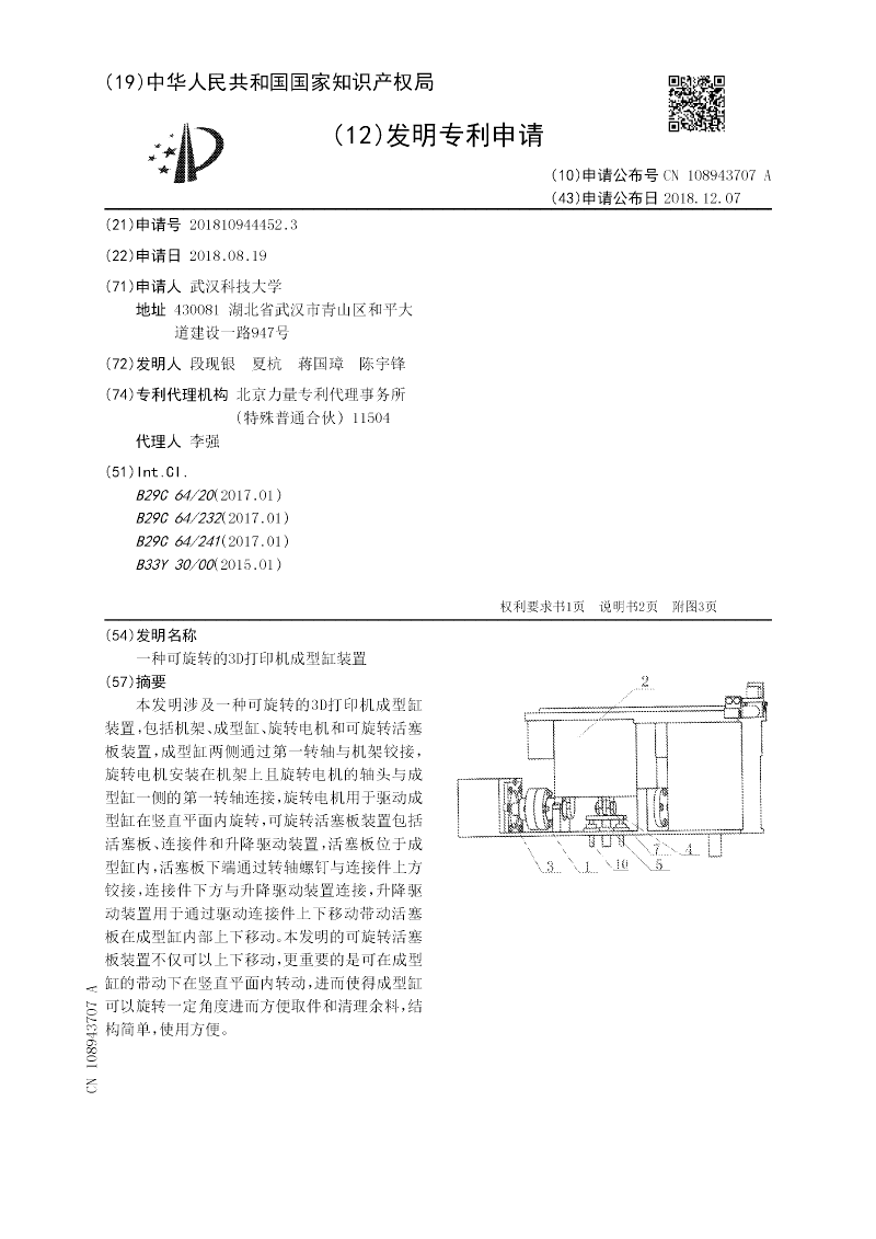 本实用新型涉及一种可旋转的3D打印机成型缸装置,包括机架、成型缸、旋转电机和可旋转活塞板装置,成型缸两侧通过第一转轴与机架铰接,旋转电机安装在机架上且旋转电机的轴头与成型缸一侧的第一转轴连接,旋转电机用于驱动成型缸在竖直平面内旋转,可旋转活塞板装置包括活塞板、连接件和升降驱动装置,活塞板位于成型缸内,活塞板下端通过转轴螺钉与连接件上方铰接,连接件下方与升降驱动装置连接,升降驱动装置用于通过驱动连接件上下移动带动活塞板在成型缸内部上下移动。本实用新型的可旋转活塞板装置不仅可以上下移动,还可在成型缸的带动下在竖直平面内转动,进而使得成型缸可以通过旋转而方便取件和清理余料,结构简单,使用方便。