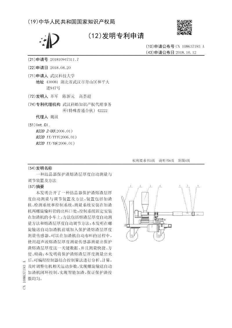 本发明公开了一种结晶器保护渣熔渣层厚度自动测量与调节装置及方法,装置包括加渣机、检测系统和控制系统;测量系统安装在加渣机两螺旋输料管的出料口处;控制系统固定安装在加渣机的小车上;方法包括熔渣层厚度自动测量方法和熔渣层厚度自动调节方法;本发明在螺旋输送自动加渣机前端加入保护渣熔渣层厚度测量传感器,可以在加渣机自动布料的过程中,使用超声波熔渣层厚度测量传感器测量出保护渣熔渣层厚度这一关键数据,并且测量快捷、方便、精确;本发明将保护渣熔渣层厚度测量出来后,可编程控制器结合控制算法进行分析、计算,及时调整电机相关运动参数,实现螺旋输送自动加渣机闭环控制,实现智能加渣,保证保护渣投撒均匀。