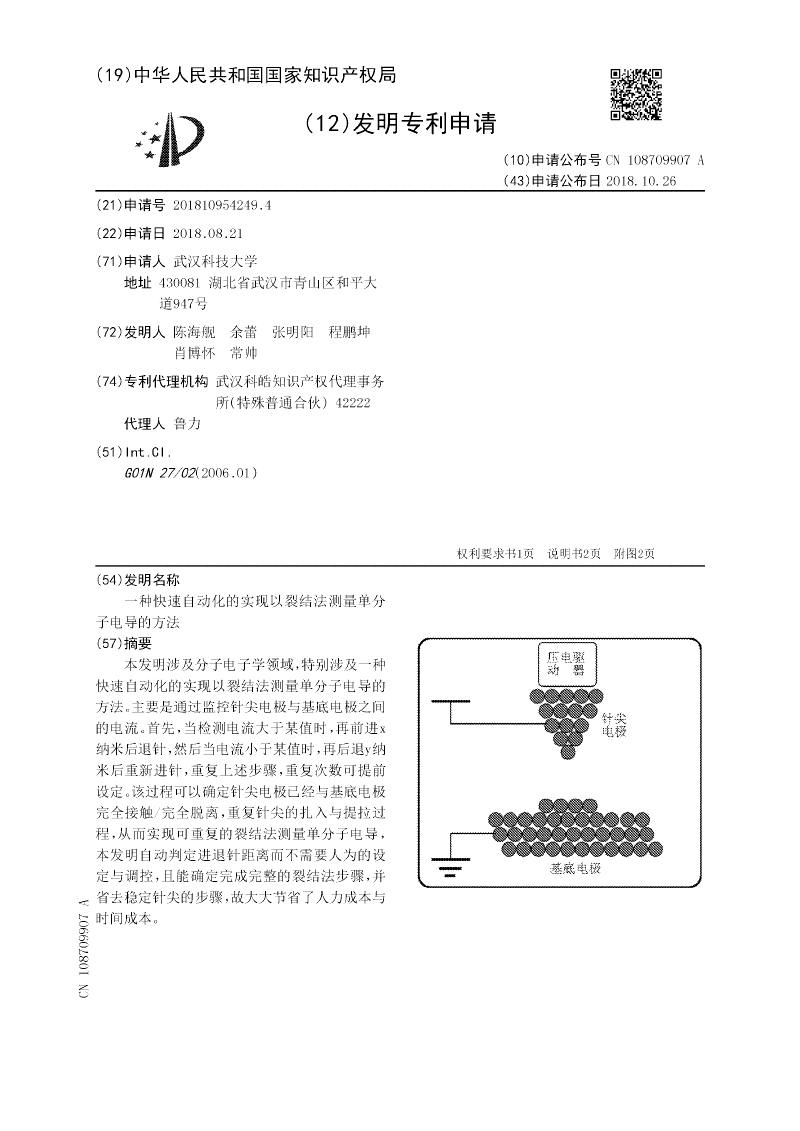 本发明涉及分子电子学领域,特别涉及一种快速自动化的实现以裂结法测量单分子电导的方法。主要是通过监控针尖电极与基底电极之间的电流。首先,当检测电流大于某值时,再前进x纳米后退针,然后当电流小于某值时,再后退y纳米后重新进针,重复上述步骤,重复次数可提前设定。该过程可以确定针尖电极已经与基底电极完全接触/完全脱离,重复针尖的扎入与提拉过程,从而实现可重复的裂结法测量单分子电导,本发明自动判定进退针距离而不需要人为的设定与调控,且能确定完成完整的裂结法步骤,并省去稳定针尖的步骤,故大大节省了人力成本与时间成本。