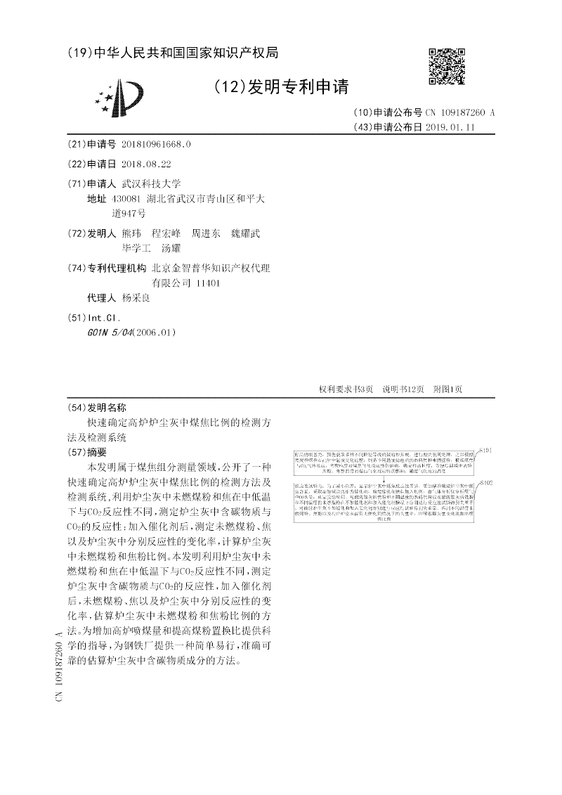 的反应性,加入催化剂后,未燃煤粉、焦以及炉尘灰中分别反应性的变化率,估算炉尘灰中未燃煤粉和焦粉比例的方法。为增加高炉喷煤量和提高煤粉置换比提供科学的指导,为钢铁厂提供一种简单易行,准确可靠的估算炉尘灰中含碳物质成分的方法。