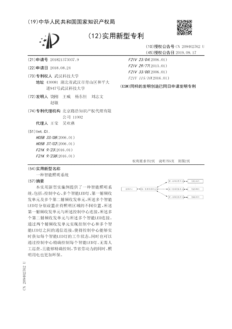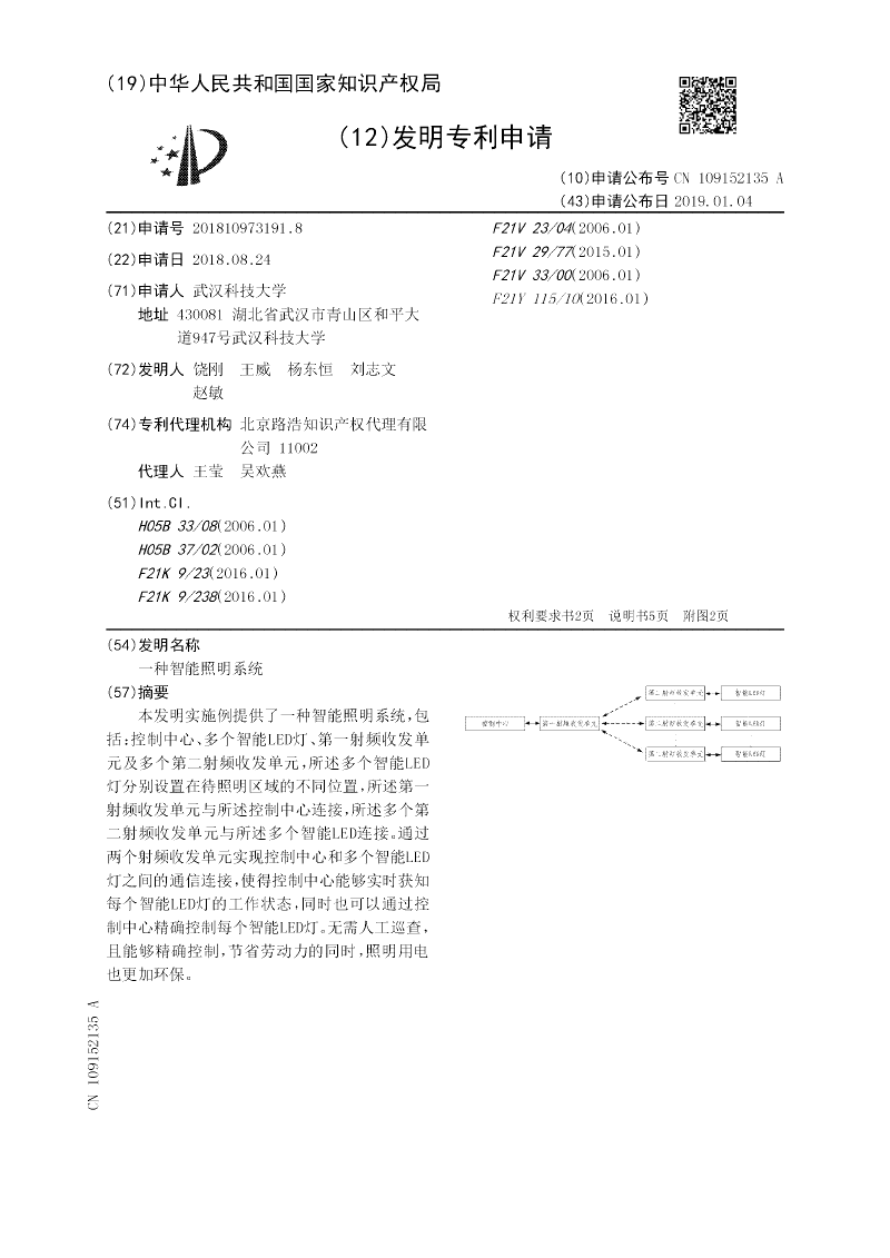 本实用新型实施例提供了一种智能照明系统,包括:控制中心、多个智能LED灯、第一射频收发单元及多个第二射频收发单元,所述多个智能LED灯分别设置在待照明区域的不同位置,所述第一射频收发单元与所述控制中心连接,所述多个第二射频收发单元与所述多个智能LED连接。通过两个射频收发单元实现控制中心和多个智能LED灯之间的通信连接,使得控制中心能够实时获知每个智能LED灯的工作状态,同时也可以通过控制中心精确控制每个智能LED灯。无需人工巡查,且能够精确控制,节省劳动力的同时,照明用电也更加环保。