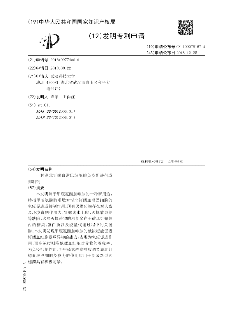 本发明属于甲硫氨酸脑啡肽的一种新用途,特指甲硫氨酸脑啡肽对湖北钉螺血淋巴细胞的免疫促进或抑制作用。现有灭螺药物存在对人畜及环境毒副作用大、钉螺离水上爬、灭螺效果差等缺陷,这些灭螺药物的机制多在于破坏钉螺体内的糖类、蛋白质以及能量代谢过程中的关键酶。本发明发现甲硫氨酸脑啡肽的低浓度能促进钉螺血细胞吞噬异物的能力,表现为免疫促进作用,而高浓度则降低螺血细胞对异物的吞噬率,为免疫抑制作用。将甲硫氨酸脑啡肽调节湖北钉螺血淋巴细胞免疫力的作用应用于制备新型灭螺药具有积极前景。