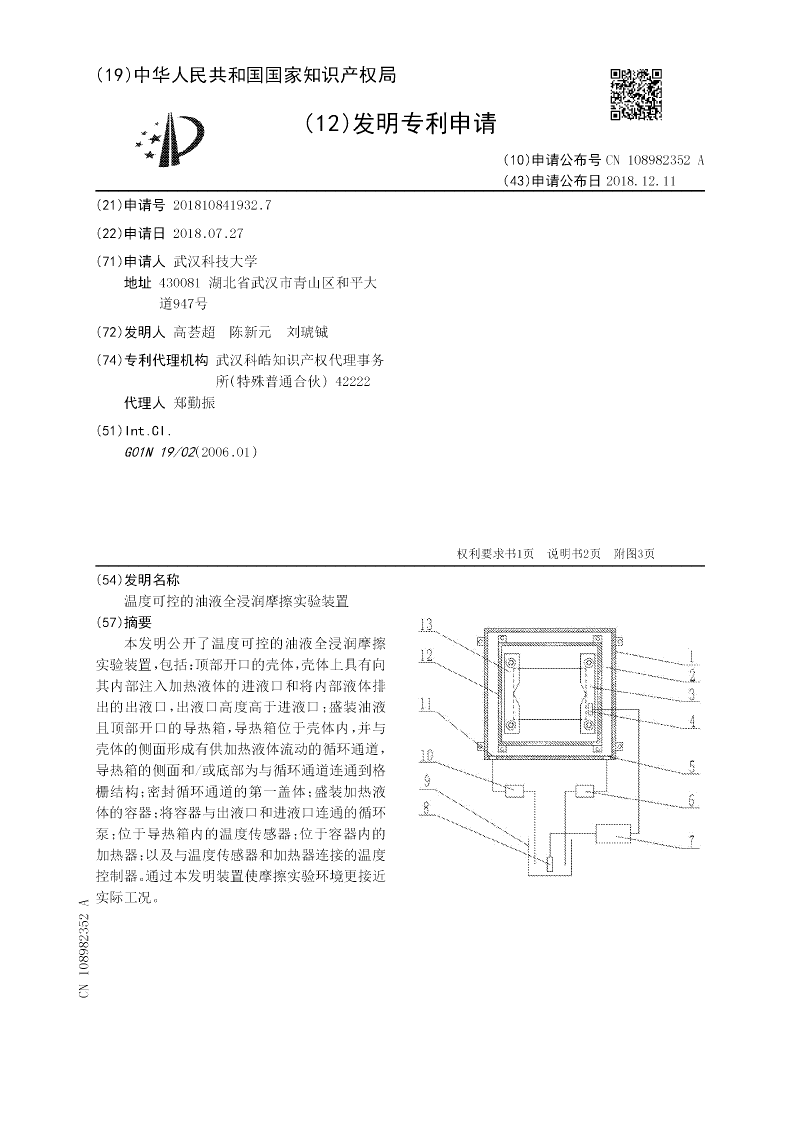 本发明公开了温度可控的油液全浸润摩擦实验装置,包括:顶部开口的壳体,壳体上具有向其内部注入加热液体的进液口和将内部液体排出的出液口,出液口高度高于进液口;盛装油液且顶部开口的导热箱,导热箱位于壳体内,并与壳体的侧面形成有供加热液体流动的循环通道,导热箱的侧面和/或底部为与循环通道连通到格栅结构;密封循环通道的第一盖体;盛装加热液体的容器;将容器与出液口和进液口连通的循环泵;位于导热箱内的温度传感器;位于容器内的加热器;以及与温度传感器和加热器连接的温度控制器。通过本发明装置使摩擦实验环境更接近实际工况。