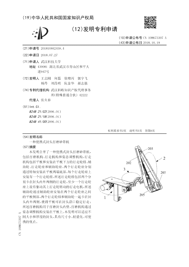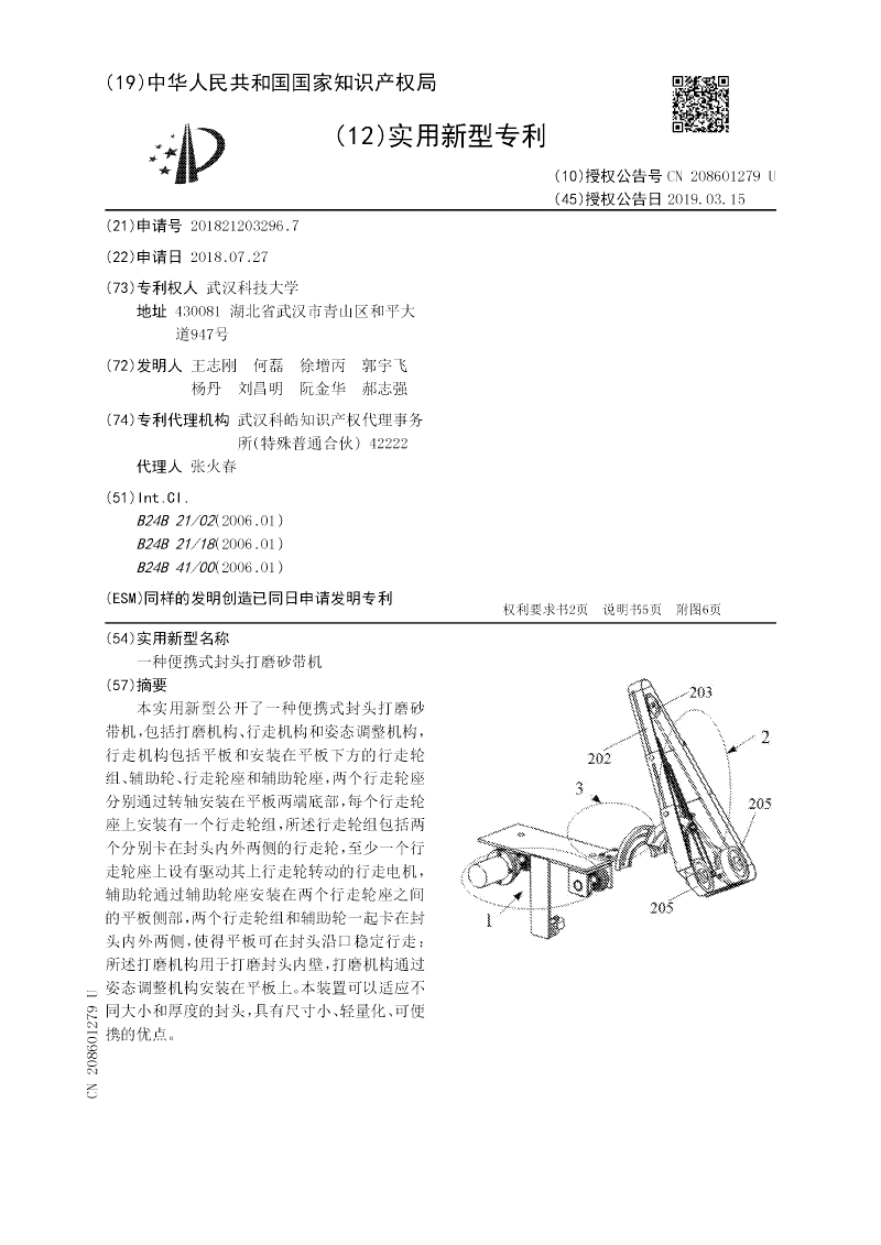 本实用新型公开了一种便携式封头打磨砂带机,包括打磨机构、行走机构和姿态调整机构,行走机构包括平板和安装在平板下方的行走轮组、辅助轮、行走轮座和辅助轮座,两个行走轮座分别通过转轴安装在平板两端底部,每个行走轮座上安装有一个行走轮组,所述行走轮组包括两个分别卡在封头内外两侧的行走轮,至少一个行走轮座上设有驱动其上行走轮转动的行走电机,辅助轮通过辅助轮座安装在两个行走轮座之间的平板侧部,两个行走轮组和辅助轮一起卡在封头内外两侧,使得平板可在封头沿口稳定行走;所述打磨机构用于打磨封头内壁,打磨机构通过姿态调整机构安装在平板上。本装置可以适应不同大小和厚度的封头,具有尺寸小、轻量化、可便携的优点。