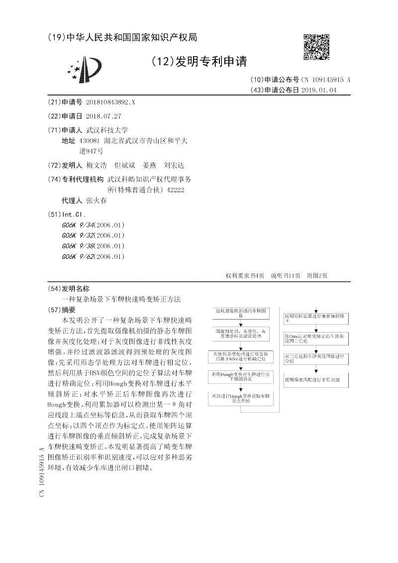 本发明公开了一种复杂场景下车牌快速畸变矫正方法,首先提取摄像机拍摄的静态车牌图像并灰度化处理;对于灰度图像进行非线性灰度增强,并经过滤波器滤波得到预处理的灰度图像;先采用形态学处理方法对车牌进行粗定位,然后利用基于HSV颜色空间的定位子算法对车牌进行精确定位;利用Hough变换对车牌进行水平倾斜矫正;对水平矫正后车牌图像再次进行Hough变换,利用累加器可以检测出某一θ角对应线段上端点坐标等信息,从而获取车牌四个顶点坐标;以四个顶点作为标定点,使用矩阵运算进行车牌图像的垂直倾斜矫正,完成复杂场景下车牌快速畸变矫正。本发明显著提高了畸变车牌图像矫正识别率和识别速度,可以应对多种恶劣环境,有效减少车库进出闸口拥堵。