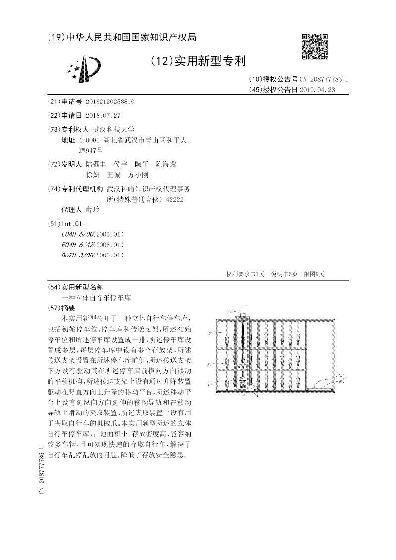 本实用新型公开了一种立体自行车停车库,包括初始停车位、停车库和传送支架,所述初始停车位和所述停车库设置成一排,所述停车库设置成多层,每层停车库中设有多个存放架,所述传送支架设置在所述停车库前侧,所述传送支架下方设有驱动其在所述停车库前横向方向移动的平移机构,所述传送支架上设有通过升降装置驱动在竖直方向上升降的移动平台,所述移动平台上设有延纵向方向延伸的移动导轨和在移动导轨上滑动的夹取装置,所述夹取装置上设有用于夹取自行车的机械爪。本实用新型所述的立体自行车停车库,占地面积小,存放密度高,能容纳较多车辆,且可实现快递的存取自行车,解决了自行车乱停乱放的问题,降低了存放安全隐患。