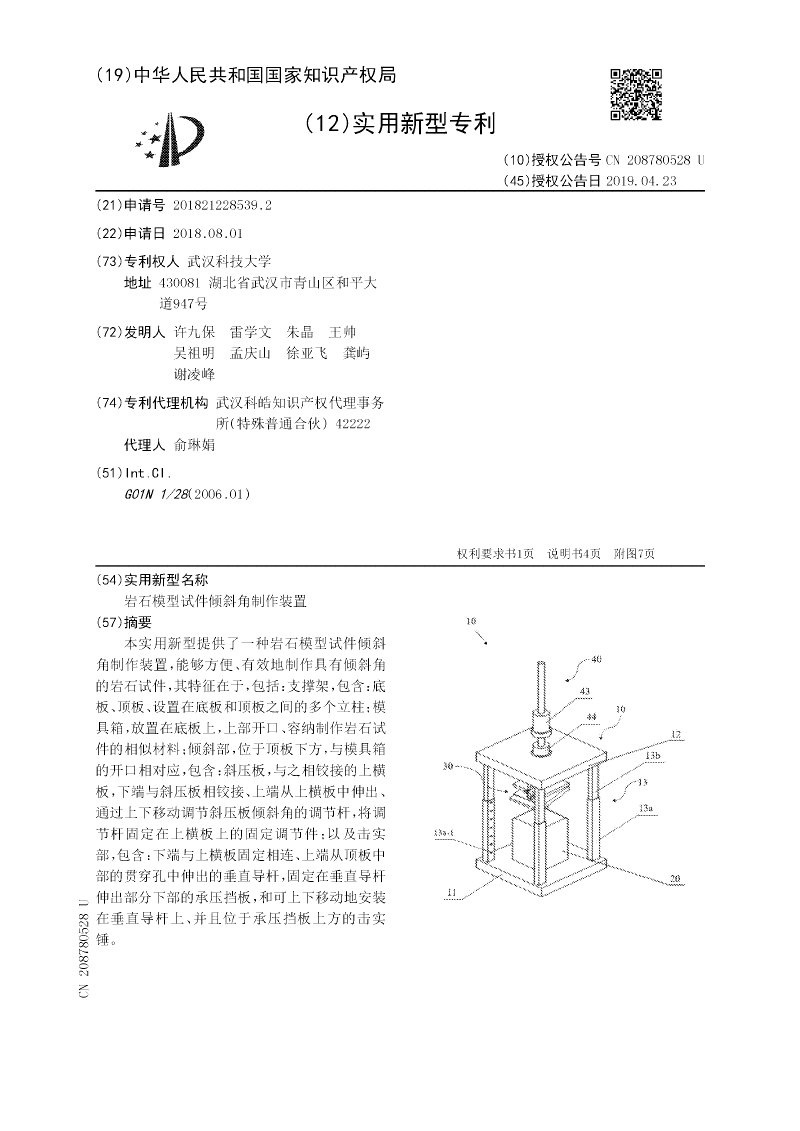 本实用新型提供了一种岩石模型试件倾斜角制作装置,能够方便、有效地制作具有倾斜角的岩石试件,其特征在于,包括:支撑架,包含:底板、顶板、设置在底板和顶板之间的多个立柱;模具箱,放置在底板上,上部开口、容纳制作岩石试件的相似材料;倾斜部,位于顶板下方,与模具箱的开口相对应,包含:斜压板,与之相铰接的上横板,下端与斜压板相铰接、上端从上横板中伸出、通过上下移动调节斜压板倾斜角的调节杆,将调节杆固定在上横板上的固定调节件;以及击实部,包含:下端与上横板固定相连、上端从顶板中部的贯穿孔中伸出的垂直导杆,固定在垂直导杆伸出部分下部的承压挡板,和可上下移动地安装在垂直导杆上、并且位于承压挡板上方的击实锤。