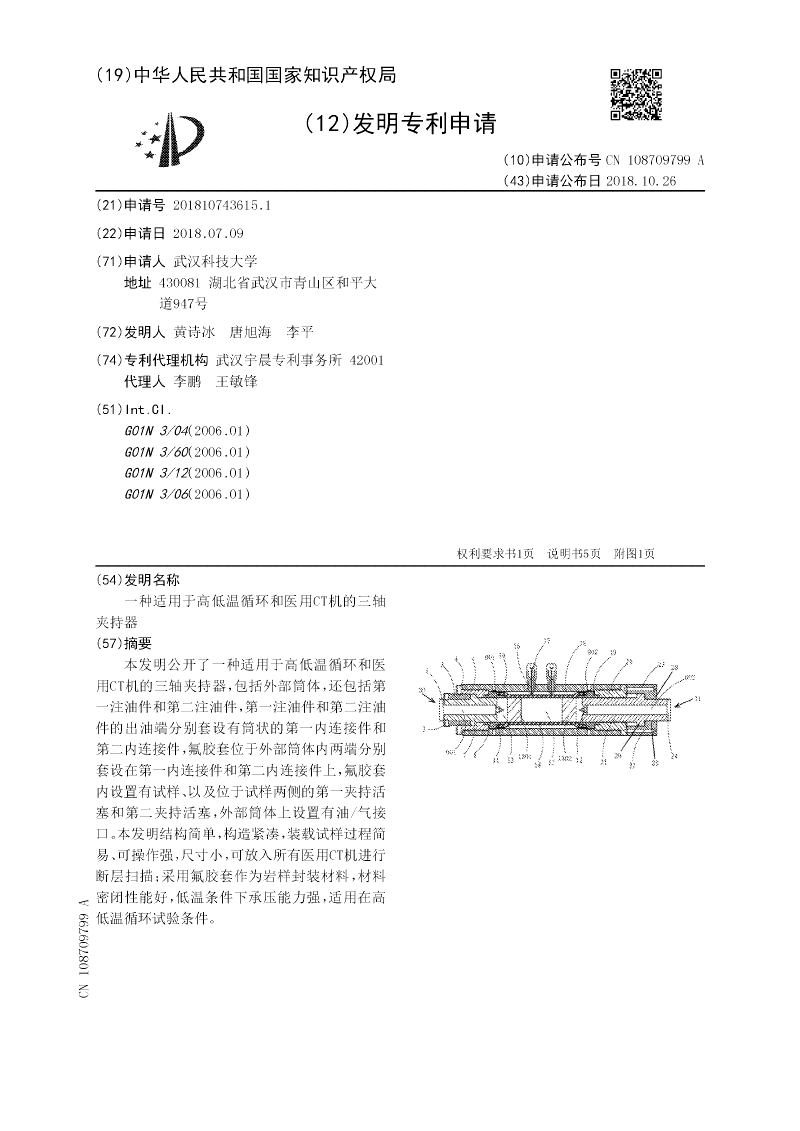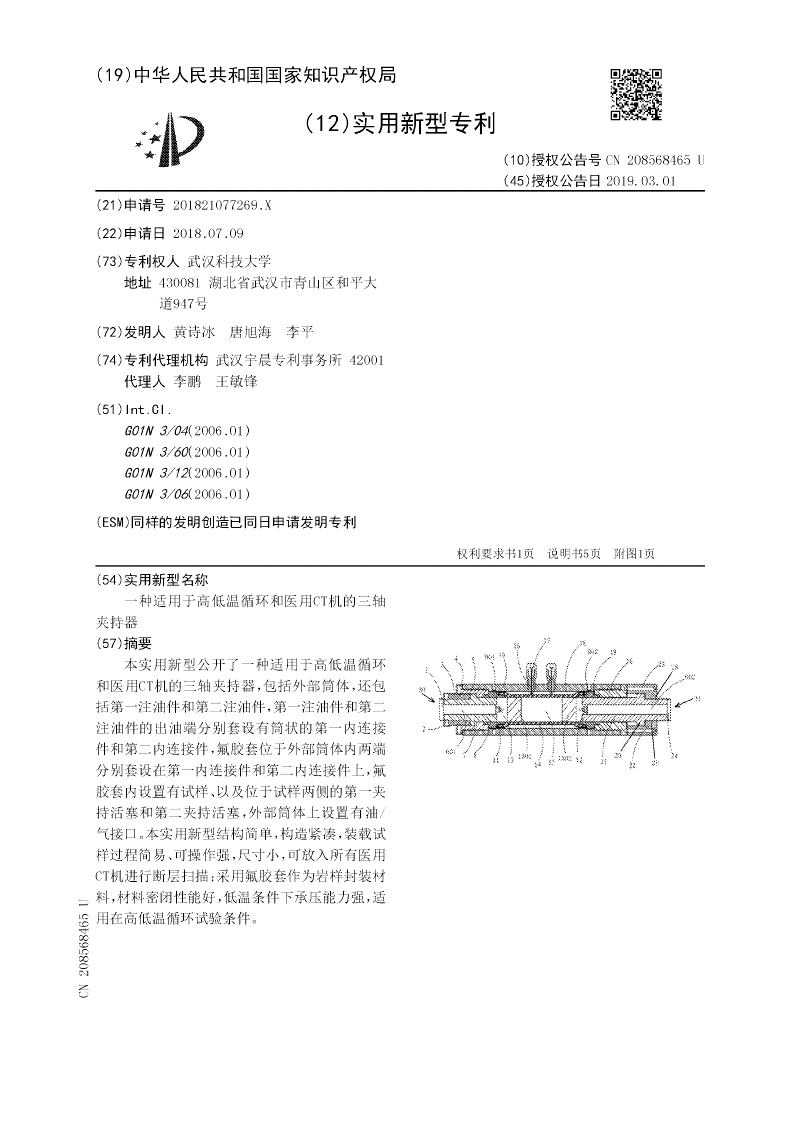 本实用新型公开了一种适用于高低温循环和医用CT机的三轴夹持器,包括外部筒体,还包括第一注油件和第二注油件,第一注油件和第二注油件的出油端分别套设有筒状的第一内连接件和第二内连接件,氟胶套位于外部筒体内两端分别套设在第一内连接件和第二内连接件上,氟胶套内设置有试样、以及位于试样两侧的第一夹持活塞和第二夹持活塞,外部筒体上设置有油/气接口。本实用新型结构简单,构造紧凑,装载试样过程简易、可操作强,尺寸小,可放入所有医用CT机进行断层扫描;采用氟胶套作为岩样封装材料,材料密闭性能好,低温条件下承压能力强,适用在高低温循环试验条件。
