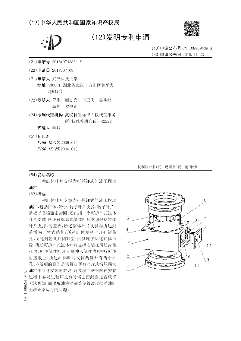 一种缸体叶片支撑为可拆卸式的液压摆动油缸,包括缸体、转子、转子叶片支撑、转子叶片、盖板以及端面密封圈,还包括一个可拆卸式缸体叶片支撑;所述可拆卸式缸体叶片支撑包括缸体叶片支撑、封盖板,所述缸体叶片支撑与所述封盖板为一体式结构;所述缸体侧壁上开有封盖孔,所述封盖孔外侧对空,内侧连接所述缸体内腔;所述可拆卸式缸体叶片支撑安装在所述封盖孔内,所述缸体叶片支撑伸入缸体内腔中;所述封盖板上,所述缸体叶片支撑两侧开有两个油孔。本发明的目的是为解决现有叶片式液压摆动油缸中叶片安装困难,叶片及端面密封圈在安装过程中易发生破坏且有时端面密封圈是否破损无法预知,而出现油液泄漏等使得液压摆动油缸无法正常运行的问题。