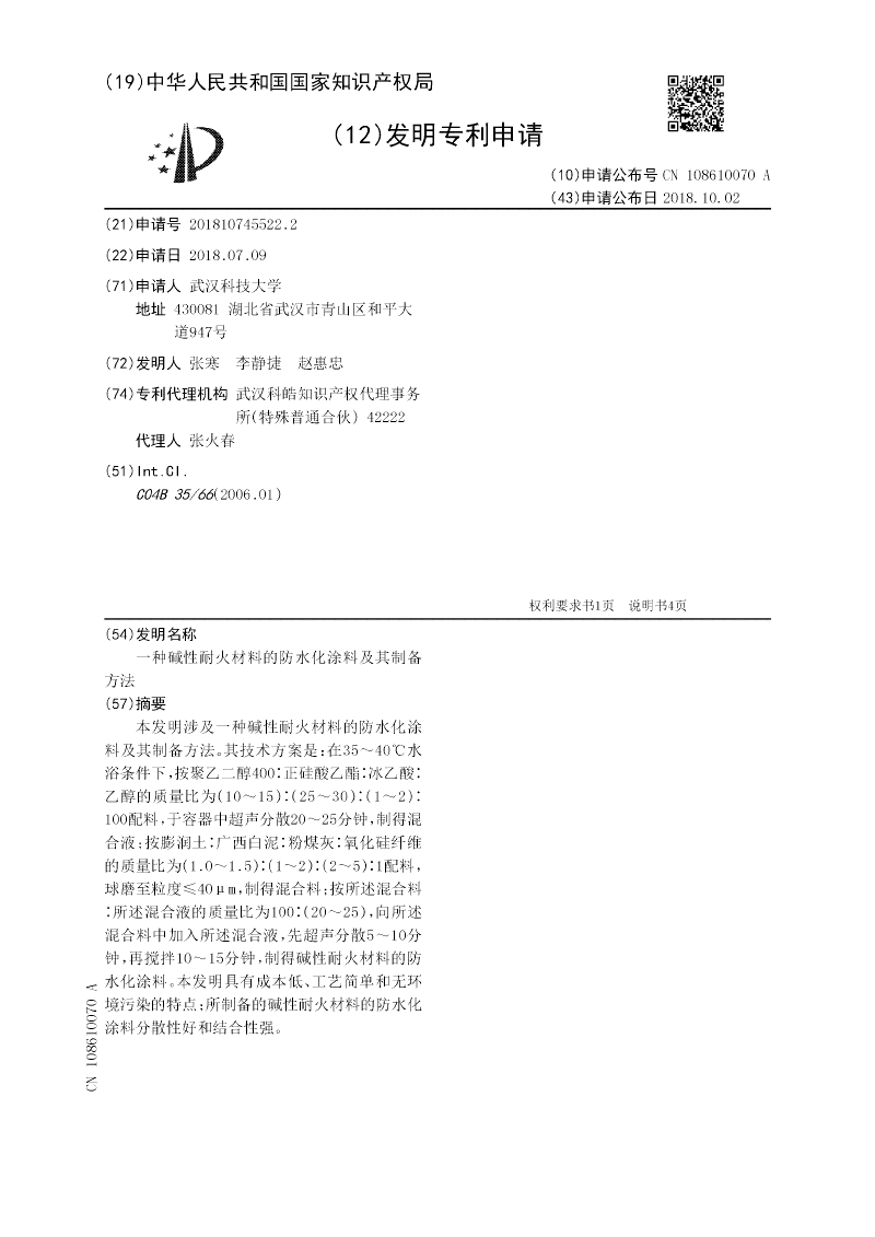 本发明涉及一种碱性耐火材料的防水化涂料及其制备方法。其技术方案是:在35~40℃水浴条件下,按聚乙二醇400∶正硅酸乙酯∶冰乙酸∶乙醇的质量比为(10~15)∶(25~30)∶(1~2)∶100配料,于容器中超声分散20~25分钟,制得混合液;按膨润土∶广西白泥∶粉煤灰∶氧化硅纤维的质量比为(1.0~1.5)∶(1~2)∶(2~5)∶1配料,球磨至粒度≤40μm,制得混合料;按所述混合料∶所述混合液的质量比为100∶(20~25),向所述混合料中加入所述混合液,先超声分散5~10分钟,再搅拌10~15分钟,制得碱性耐火材料的防水化涂料。本发明具有成本低、工艺简单和无环境污染的特点;所制备的碱性耐火材料的防水化涂料分散性好和结合性强。