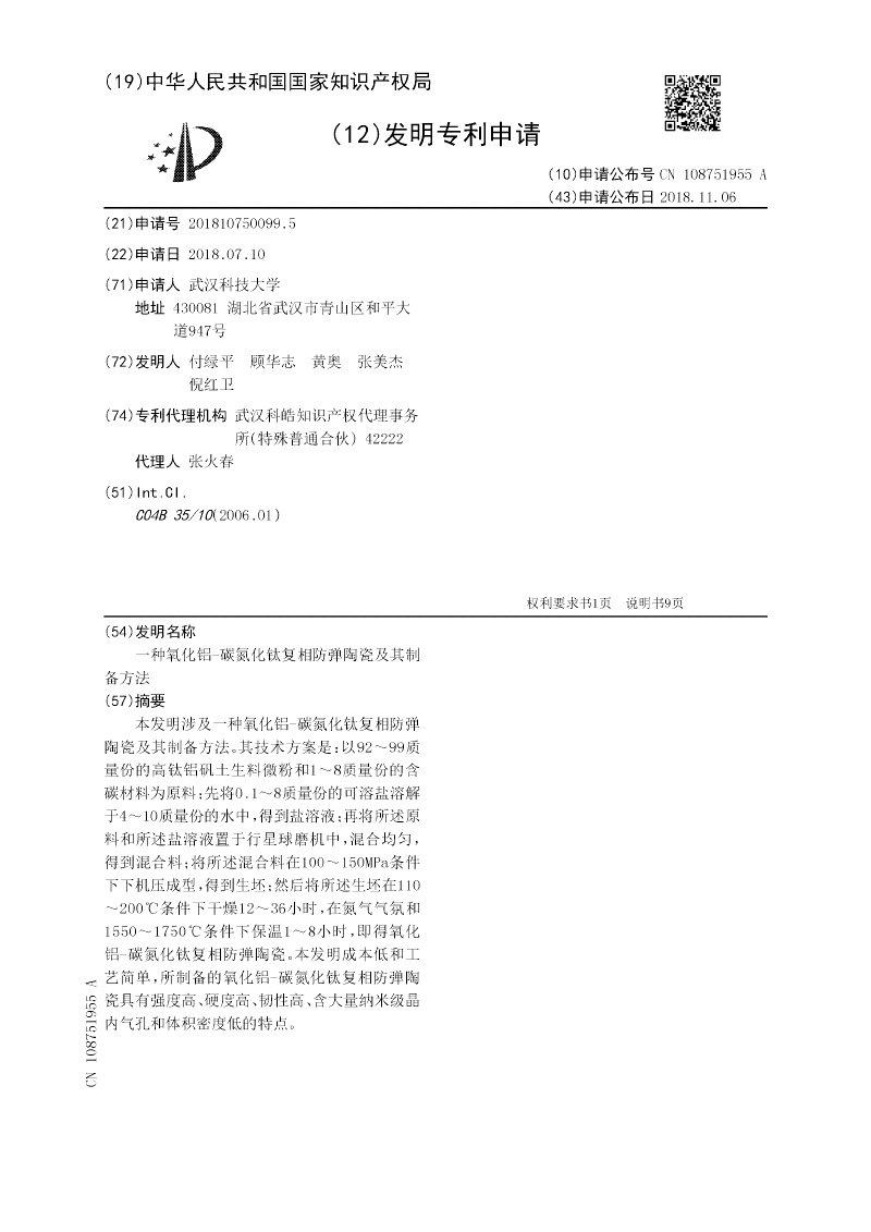 一种氧化铝-碳氮化钛复相防弹陶瓷及其制备方法