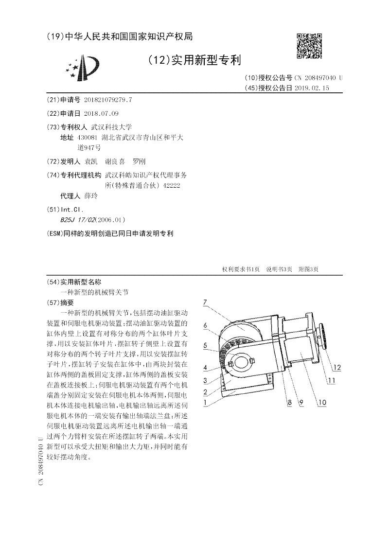 一种新型的机械臂关节,包括摆动油缸驱动装置和伺服电机驱动装置;摆动油缸驱动装置的缸体内壁上设置有对称分布的两个缸体叶片支撑,用以安装缸体叶片,摆缸转子侧壁上设置有对称分布的两个转子叶片支撑,用以安装摆缸转子叶片,摆缸转子安装在缸体中,由两块封装在缸体两侧的盖板固定支撑,缸体两侧的盖板安装在盖板连接板上;伺服电机驱动装置有两个电机端盖分别固定安装在伺服电机本体两侧,伺服电机本体连接电机输出轴,电机输出轴远离所述伺服电机本体的一端安装有输出轴端法兰盘;所述伺服电机驱动装置远离所述电机输出轴一端通过两个力臂杆安装在所述摆缸转子两端。本实用新型可以承受大扭矩和输出大力矩,并同时能有较好摆动角度。