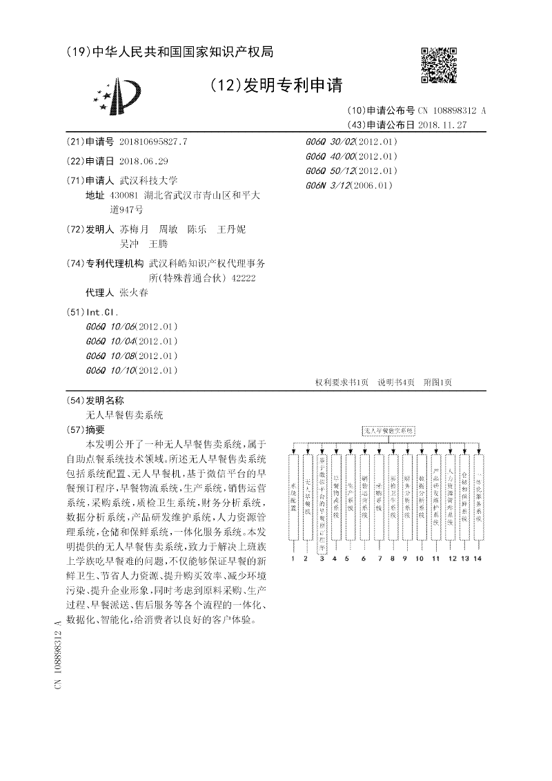 本发明公开了一种无人早餐售卖系统,属于自助点餐系统技术领域。所述无人早餐售卖系统包括系统配置、无人早餐机,基于微信平台的早餐预订程序,早餐物流系统,生产系统,销售运营系统,采购系统,质检卫生系统,财务分析系统,数据分析系统,产品研发维护系统,人力资源管理系统,仓储和保鲜系统,一体化服务系统。本发明提供的无人早餐售卖系统,致力于解决上班族上学族吃早餐难的问题,不仅能够保证早餐的新鲜卫生、节省人力资源、提升购买效率、减少环境污染、提升企业形象,同时考虑到原料采购、生产过程、早餐派送、售后服务等各个流程的一体化、数据化、智能化,给消费者以良好的客户体验。