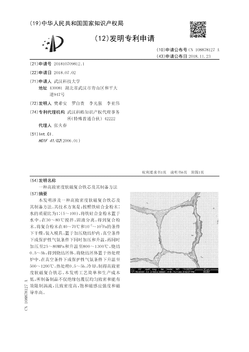 Pa的条件下干燥,装入模具,置于加压烧结炉内,真空条件下或保护性气氛条件下同时加压和升温,再同时加压至25~80MPa和升温至800~1300℃,烧结0.5~5h,得到烧结坯体。将烧结坯体置于热处理炉中,在真空条件下或保护性气氛条件下升温至500~1200℃,热处理0.5~5h,冷却,制得高致密度软磁复合铁芯。本发明工艺简单和生产成本低,所制备制品不仅绝缘包覆层均匀致密和能有效限制涡流,且致密度高,饱和磁感应强度和磁导率高。