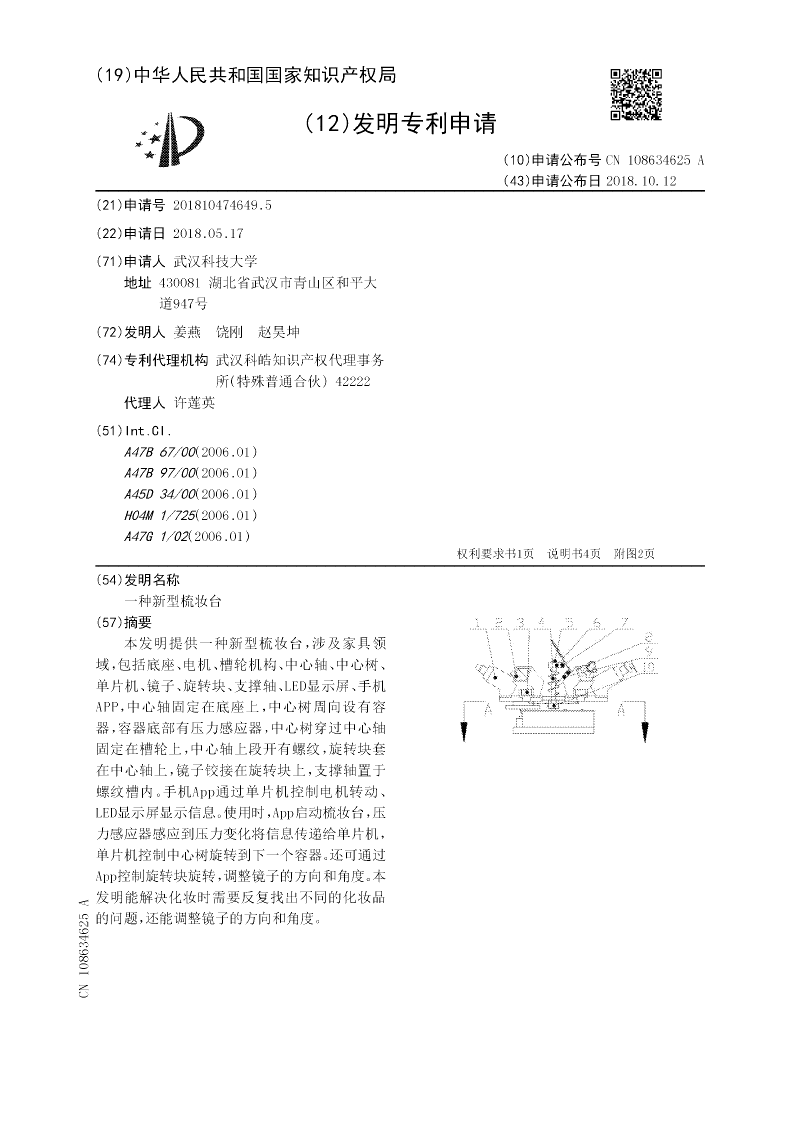 本发明提供一种新型梳妆台,涉及家具领域,包括底座、电机、槽轮机构、中心轴、中心树、单片机、镜子、旋转块、支撑轴、LED显示屏、手机APP,中心轴固定在底座上,中心树周向设有容器,容器底部有压力感应器,中心树穿过中心轴固定在槽轮上,中心轴上段开有螺纹,旋转块套在中心轴上,镜子铰接在旋转块上,支撑轴置于螺纹槽内。手机App通过单片机控制电机转动、LED显示屏显示信息。使用时,App启动梳妆台,压力感应器感应到压力变化将信息传递给单片机,单片机控制中心树旋转到下一个容器。还可通过App控制旋转块旋转,调整镜子的方向和角度。本发明能解决化妆时需要反复找出不同的化妆品的问题,还能调整镜子的方向和角度。