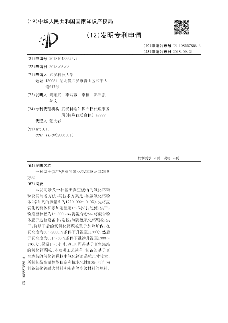 本发明涉及一种基于真空烧结的氧化钙颗粒及其制备方法。其技术方案是:按氢氧化钙粉体∶添加剂的质量比为1∶(0.002~0.05),先将氢氧化钙粉体和添加剂湿磨1~5小时,过滤,烘干,粉磨至粒径为1~300μm,得混合粉体。将混合粉体置于造粒设备中,造粒,制得氢氧化钙颗粒,烘干。将烘干后的氢氧化钙颗粒置于加热炉内,在真空度为50~2000Pa条件下升温至1100℃,然后于真空度为0.1~50Pa条件下继续升温至1300~1700℃,保温1~5小时,冷却,即得基于真空烧结的氧化钙颗粒。本发明工艺简单,制备的基于真空烧结的氧化钙颗粒中氧化钙的晶粒尺寸较大,所制制品高温性能稳定和抗水化性能好,可作为制备氧化钙耐火材料和陶瓷等高级材料的原料。