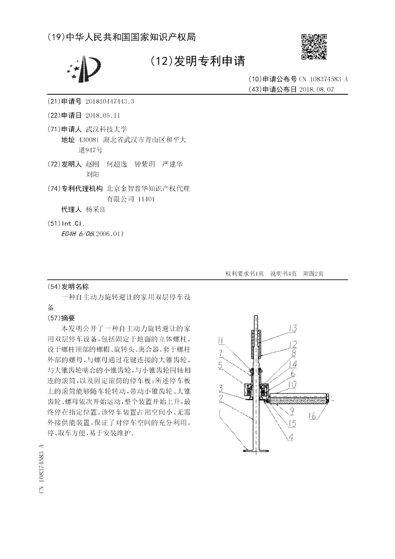 本发明公开了一种自主动力旋转避让的家用双层停车设备,包括固定于地面的立体螺柱,设于螺柱顶部的螺帽、旋转头、离合器,套于螺柱外部的螺母,与螺母通过花键连接的大锥齿轮,与大锥齿轮啮合的小锥齿轮,与小锥齿轮同轴相连的滚筒,以及固定滚筒的停车板;所述停车板上的滚筒能够随车轮转动,带动小锥齿轮、大锥齿轮、螺母依次开始运动,整个装置开始上升,最终停在指定位置。该停车装置占用空间小、无需外接供能装置,保证了对停车空间的充分利用,停、取车方便,易于安装维护。