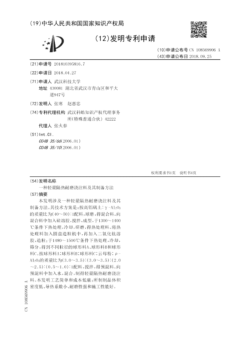 本发明涉及一种轻量隔热耐磨浇注料及其制备方法。其技术方案是:按高铝矾土︰γ‑Al2O3的质量比为(40~50)︰1配料,球磨,得混合料。向混合料中加入硅溶胶,搅拌,成型,于1300~1400℃条件下热处理,冷却,研磨,得热处理料。将热处理料加入圆盘造粒机中,再加入二氧化钛溶胶,造粒;于1480~1500℃条件下热处理,冷却,筛分,得到不同粒径的球形料A、球形料B和球形料C。按球形料A∶球形料B∶球形料C∶云母粉∶ρ‑Al2O3的质量比为(3.0~3.5)︰(3.0~3.5)︰(2.0~2.5)︰(0.5~1.0)︰1配料,搅拌,得预混料。向预混料中加入水,混合,制得轻量隔热耐磨浇注料。本发明工艺简单和成本低廉;所制制品体积密度低、导热系数小、耐磨性强和施工性能好。